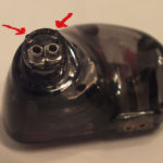 Build quality on the V30 is a mixed bag. Shells are transparent smoked plastic and are well put together with no slop at the seams. Some will immediately liken the v30 to the AS06 or AS10 shape but it is smaller in most dimensions especially in thickness which I find makes it sit in the ear more comfortably. As good as the shell construction is, they are not without problems. They ship with mid sized tips and in exchanging them for the large size I usually use, one of the grills fell off the nozzle. Within a week, the second grill had fallen off even with a tip in place to hold it on. Nozzles do not have a true lip but do have a series of raised studs around the rim to hold tips in place (these can be felt with a fingernail more easily than seen due to the shell color – see red arrows). I will say that when the first thing you see is the dual BAs aimed straight at your eardrum with no form of damping or filtering. I was a bit apprehensive about what these might sound like.