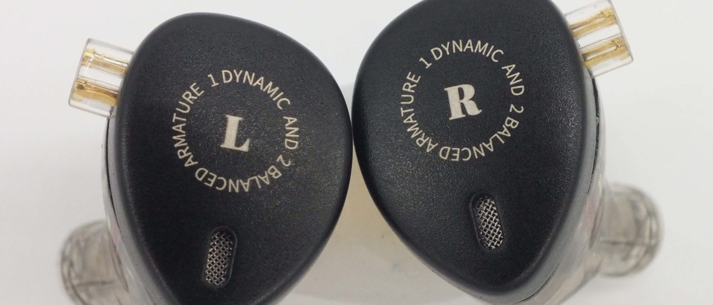 The KB06 uses a 2 piece shell with the inner shell and nozzle made of smoked transparent plastic and the outer being an aluminum alloy. The outer shells are very labeled “1 dynamic, 2 balanced armatures” with either L or R in the center. The Hoods on the cable are clearly marked as well making mating an easy task. Vents for the dynamic driver are on both the outer shell as a small slot with a screen and two pin-hole vents on the inner shell, one behind the nozzle and the other inline with the bi-pin connector. Nozzles exit the bottom of the inverted teardrop shape with a slight forward rake and a small lip for tip retention. The KB06 is a fairly small and light in-ear and when combined with tip-up wear fit is easy and comfortable. Insertion depth is slightly deep and isolation is better than expected for a vented shell.