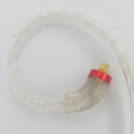 The provided cable is 8 core silver plated copper braid from the clear plastic housed 90º gold plated 3.5mm jack to the barrel shaped brushed aluminum splitter. Each Core in turn has 19 strands of silver coated copper wire. A small knurled chin slider mates to the splitter when not in use. two 4 wire braids exit the splitter and terminate in clear pre-formed hooks, with clear mmcx housings. The housings have either a red or blue ring to identify left/right with the earpieces having letter to match on the inner surface behind the mmcx connector as well.