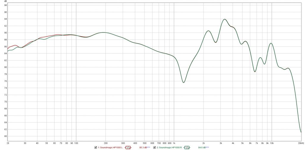 There is some warmth brought to the lower mids but no obscuring of the lower mids from bass bleed. My Frequency response graph shows a bit of a drop in the midrange that I don’t hear so I am left questioning if that is more an artifact of my rig than a feature of the headphones as I find the mids to be in good proportion to the mid-bass and then move forward as they move toward the lower treble. The 151 got panned as having poorly tuned mids and it generally was one of the low points of the previous Soundmagic models. It is quite obvious that Soundmagic took the criticisms to heart and has done a good job of cleaning up the mids and making them more present in the mix. Guitar timbre is good and I especially like the growl on blues guitar as rendered on the Hp1000. Mids are notably more textured and detailed than on their predecessor. A push of the upper mids forward brings vocals to the front with exaggerating them.