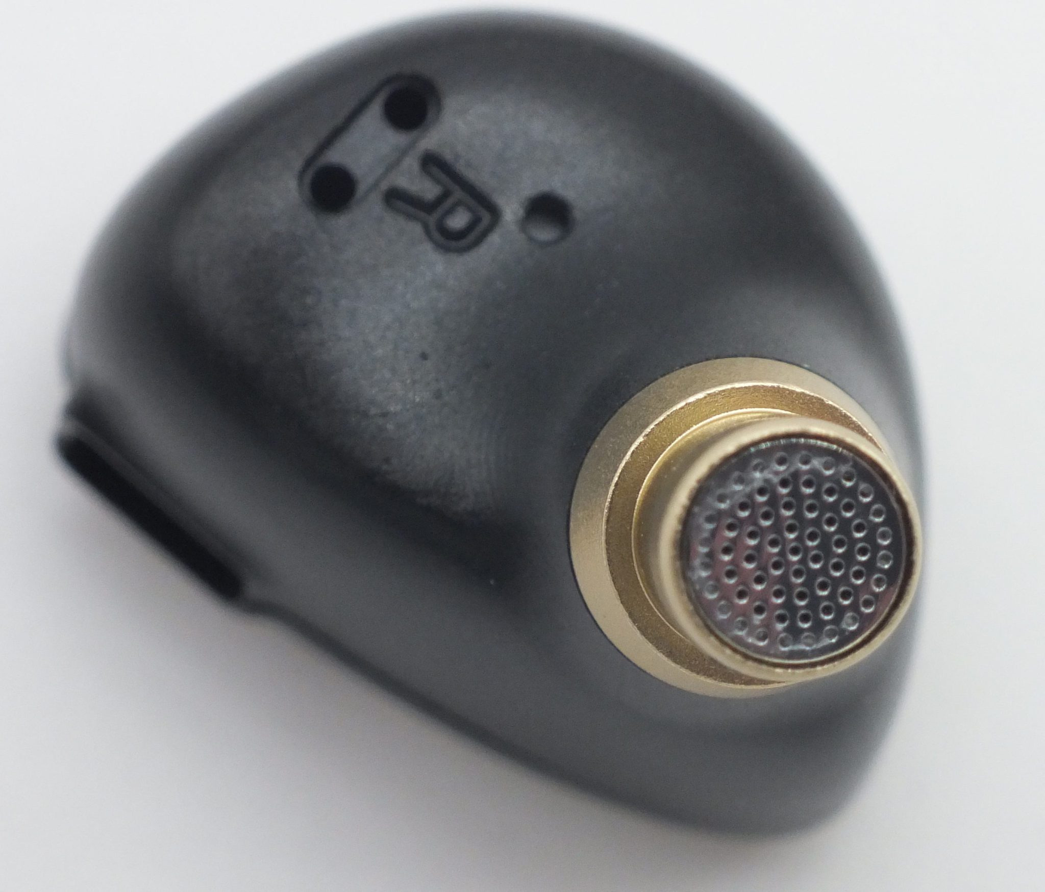 The earpieces are 3 part shells with the body being machined from aluminum and the nozzles of brass. The seam between faceplate and body is roughly 3mm from the lead edge and is well mated with no gaps, and on my particular pair it is easiest to find by feel with a fingernail as it blends very well visually. By feel, the faceplate is just ever so slightly smaller than the body. Bi-pin connectors have a raised frame around them that is machined into the faceplate and the body rather than making it from a single piece and is extremely well mated as visually the lines formed by the mating of parts show no separation or misalignment. The shells are finished in matte black with a gold ring around the perimeter of the faceplate and a gold colored nozzle accenting the package. L and R are stamped on the inside of the earpieces with a small vent below the lettering with a white filter? beneath and two larger vents nestled in a slot cut in the space immediately behind the lettering. I include the question mark as I cannot tell what the material is, only that there is something white and non-descript over the single vent while the two other vents appear to lead directly to the internals without any such filter.