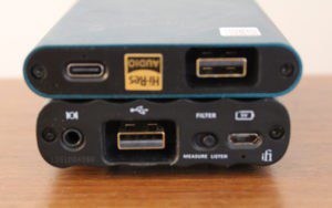 The hip dac is a very solid device in hand with all metal construction. Those familiar with the X series products will recognize the form factor as the Hip is roughly the same height and width but slightly thinner by comparison. For those unfamiliar, the hip dac is slightly wider than a deck of playing cards and roughly as tall and as thick. The hip dac also foregoes the polished metal housing of the X series in favor of anodized aluminum which is both durable and less expensive again allowing for more of your dollar to go to internals. The front, from left to right, has a single ended 3.5mm output (that also supports x-balanced), a 4.4mm balanced output, a brass volume control (with LEDs on either side to indicate power on/off and input format), the xBass control and led indicator, and lastly the gain control (power match) and led indicator. The rear panel is a bit less busy with a full sized recessed male USB type A connection for data only as is in common use on ifi products, and a USB type-C female for charging only and an LED indicator for battery status. Its a tidy package with little wasted space.