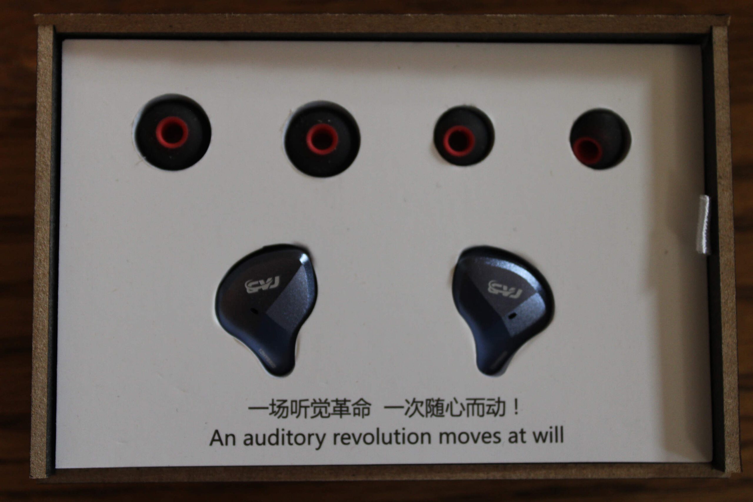 All of the CVJ products I have tested have come in the same style box which is unique in that it is made out of pressed wood rather than cardboard and a good bit stiffer than the average budget packaging. These are book-fold style boxes in matte black with CVJ in silver on the front and specs on reverse in Chinese and English. The packaging is more subdued than some and gives little hint to what is inside from the top. Flipping it helps, but this certainly is more of a storage container than a marketing tool. Inside, the top level is a foam tray containing the earpieces and tips beneath which a compartment holds the cable, carrying case, and other accessories. In the case of the CsN, the kit consists of the earpieces, 3 sets of silicone tips (SML), the cable, cable tie, and cloth carrying bag. While this was an acceptable kit for the sub-$30 Cs8, it does seem a little lacking for a $50-75 in-ear (ali express $50, amazon closer to $75) and the inclusion of foams, additional tips, and a better carry option would be appreciated. Having said that, remembering this is a 12 driver in-ear at the $50 mark, I’d much rather they spent money on the technology in the earpiece than the bag so this is certainly not a deal-breaker.