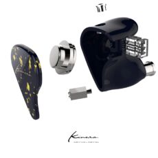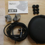 The Bd005 comes in a now familiar package but at the same time one that is unique to Kinera. The Hexagon box has sort of become a trademark with earlier models like the Sif arriving in similar fashion. This time the box is black with the gold writing and the earpieces depicted on the front and the specs on the reverse. Inside the cover a hexagonal card advertising for the Kinera website and forum rests on top with a clamshell case hiding underneath. The case contains the earpieces, cable, and 3 sets of tips. A manual rest beneath the case and rounds out the kit. Tips are silicones in small medium and large and are shallower than standard although they do use a standard 4mm bore size.