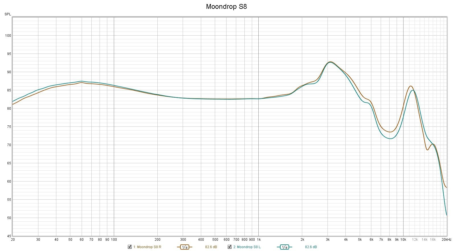 The lower treble continues the climb of the upper-mids but then drops back just about as quickly as it arrives so there is a bit of extra energy from about 2.5k-4.5kHz which translates into enough to push vocals forward and give most instruments the needed 1st harmonic to sound natural without adding too much energy and sounding hot. Strings benefit here as getting the harmonics correct on strings is what differentiates the good from the great in this market. Detail levels are quite good without being aggressive or over-stated and snare rattle retains a sharp attack and good texture. Cymbals fall a hair short of real as the drop above 4.5kHz hurts them mildly but does keep the S8 from getting harsh or sibilant. There is some energy added back into the mix between 12kHz and 14kHz that helps keep the s8 open and gives it needed top end air. Final roll-off is somewhere above my limit (14kHz or so).