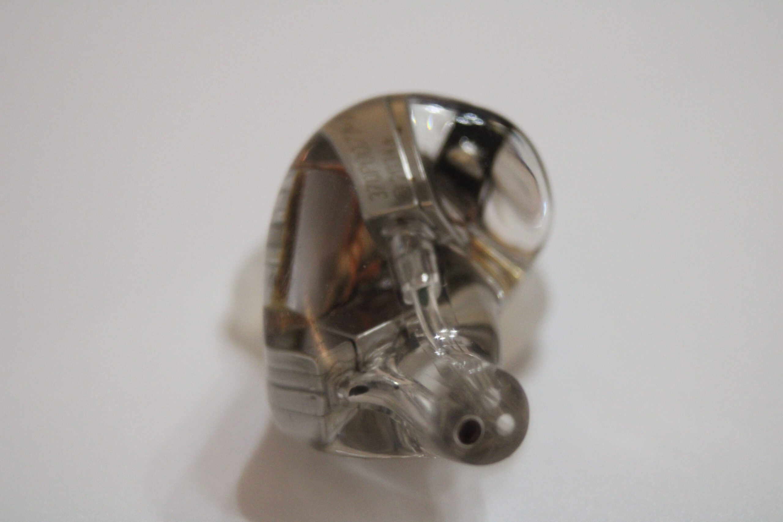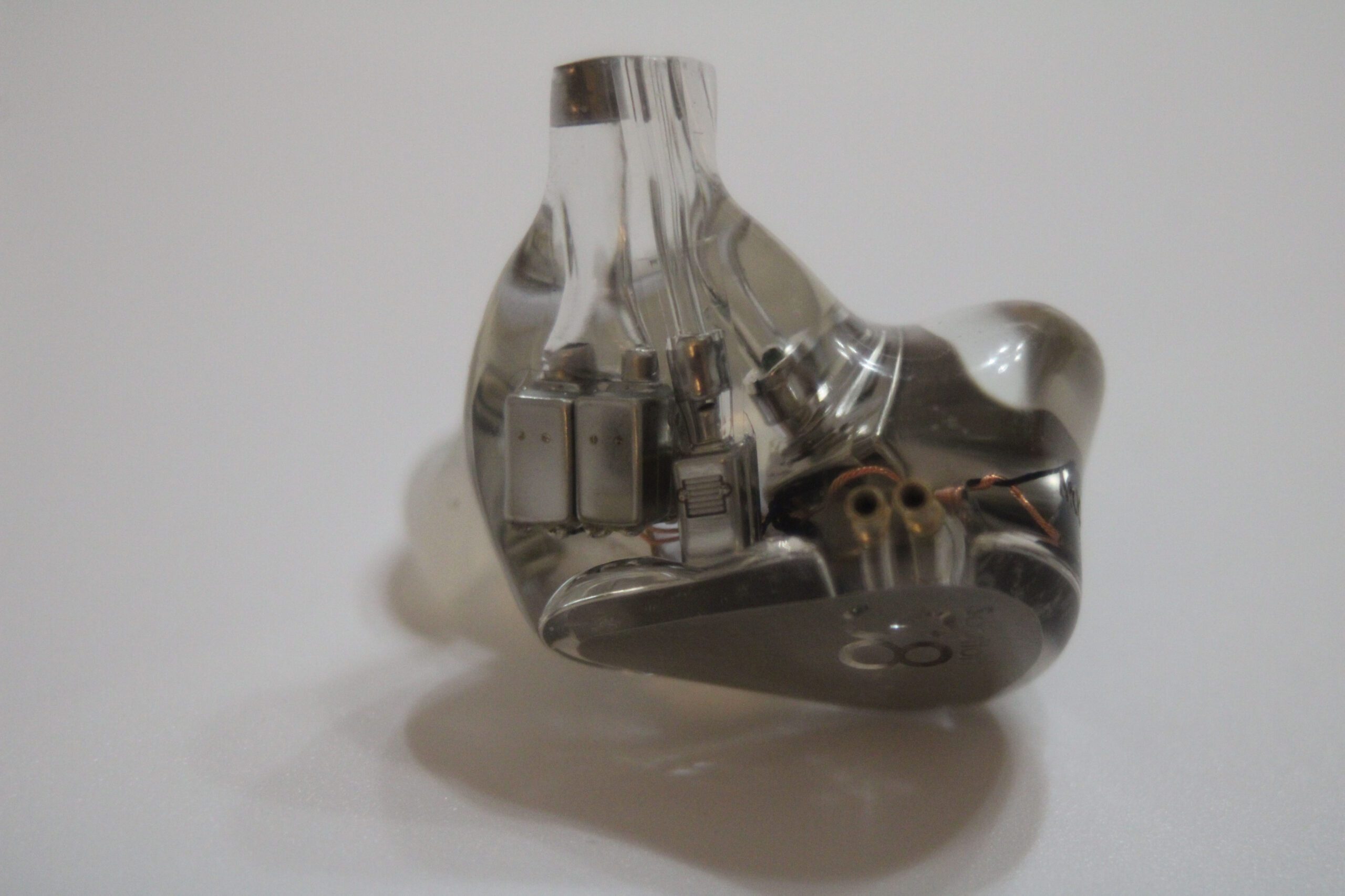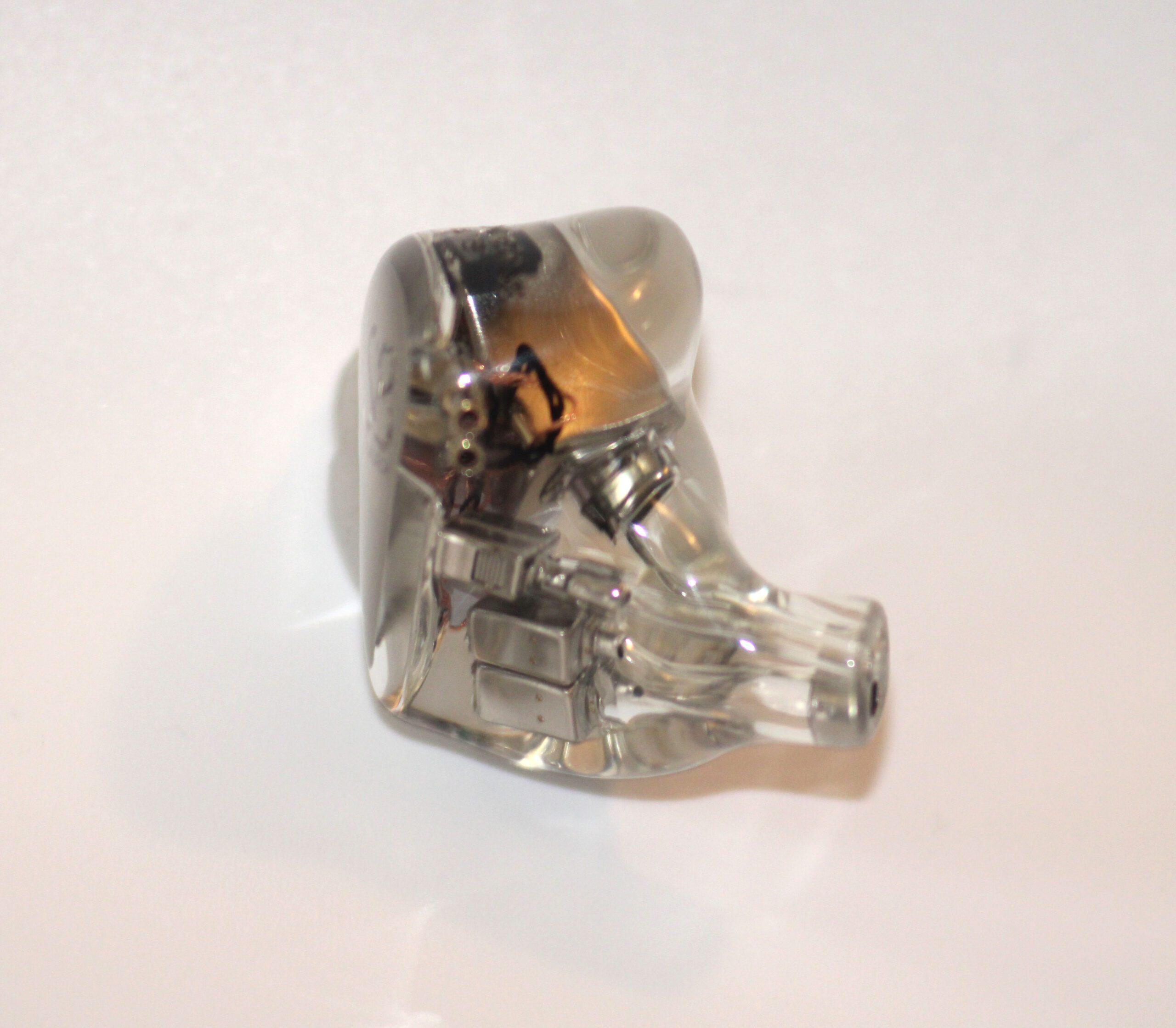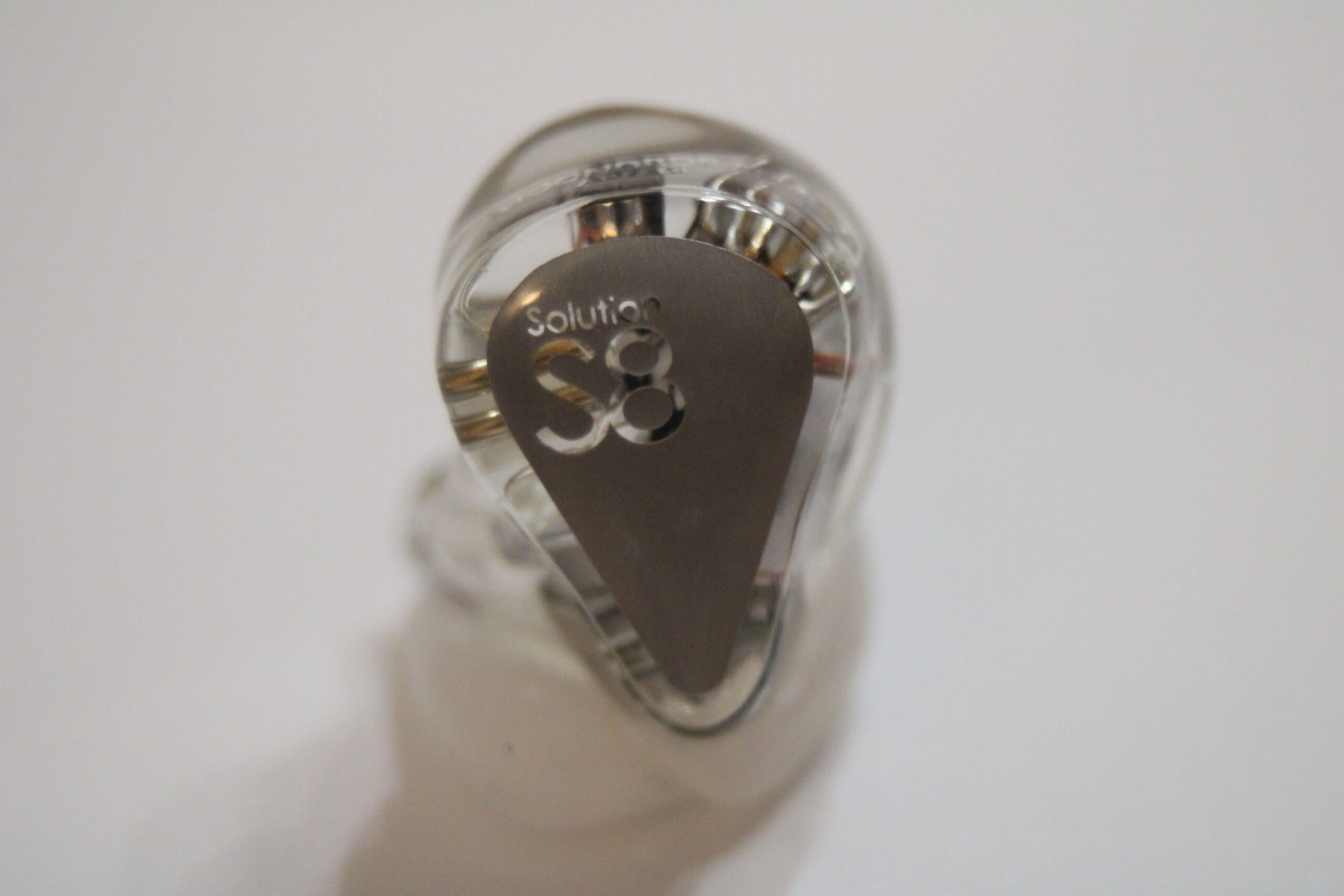 The S8 uses an all resin shell in the standard semi-custom shape with polished clear resin allowing for every detail inside the unit to be seen and studied. Shells are 2 part with an inner shell and nozzle and a very shallow faceplate with a silver insert with Solution S8 in relief. While I first thought the insert to be metal, putting a light behind it shows it to be translucent so I suspect it may be painted on the inner surface of the faceplate. The nozzles have a pronounced forward rake and sit largely in front of the main body of the earpiece when worn. Each nozzle has 3 sound bores, 1 lined and 2 cut directly into the resin and neither has a lip for tip retention. Roughing the outer surface of the nozzles with a fine steel wool or file might help with tip retention although I didn’t find it an issue using spin-fits or the provided tips. Because the body sits largely behind the nozzles, isolation is only average and some outside noise can be expected. The shells are mid-sized as one might expect with 8 drivers per side but are shaped well and were comfortable for extended wear for me. Those with smaller ears may wish to audition before purchase.
