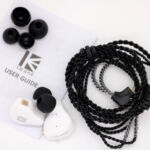 Those familiar with the typical small white slip-cover style box will immediately recognize the packaging. Line drawing and name on front, specs on rear of slip cover. Inside, the box, we have the earpieces resting in a black plastic tray with the rest of the kit hiding underneath. The kit consists of earpieces, cable, and three sets (SML) of silicone tips. The kit seems pretty spartan even for a budget model but I’d much rather see money spent in R&D and driver components than on another clamshell case. Remembering that these retail for less than 20 USD, we do have to temper our expectations accordingly.