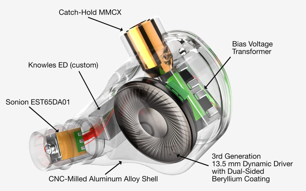 The EST 112 is a tri-bred model using a 13.5mm dynamic driver, a customized Knowles ED balanced armature tweeter, and a pair of Sonion EST Supertweeter electret drivers. The naming convention reflects this 1 dynamic, 1 BA, 2 EST so not the most original of names, but at least more descriptive than most. This is an interesting mix of drivers as the 13.5mm dynamic was designed in-house at Dunu and has a beryllium coating on both sides of the diaphragm for enhanced stiffness while remaining as light as possible. The Knowles ED package is customized specifically to mate to the dynamic driver as tightly as possible, and the twin ESTs provide additional top end extension compared to a BA top end. Nominal impedance is listed as 10Ω with a sensitivity of 110 dB/mW. This makes the 112 easy to drive, but susceptible to problems caused by high output impedance of some sources. With most recent portables having an output impedance of less than 1Ω, this won’t be as big an issue as it would have been four or five years ago when it was not uncommon for sources to have output impedance of nearly as high that of the 112. I found it was easy to drive using a phone and dongle or a low powered dap, but it does scale well with additional power and with improvemetns in dac. My favorite pairing is with the WM1A which put the micro-detail level of the 112 on full display.
