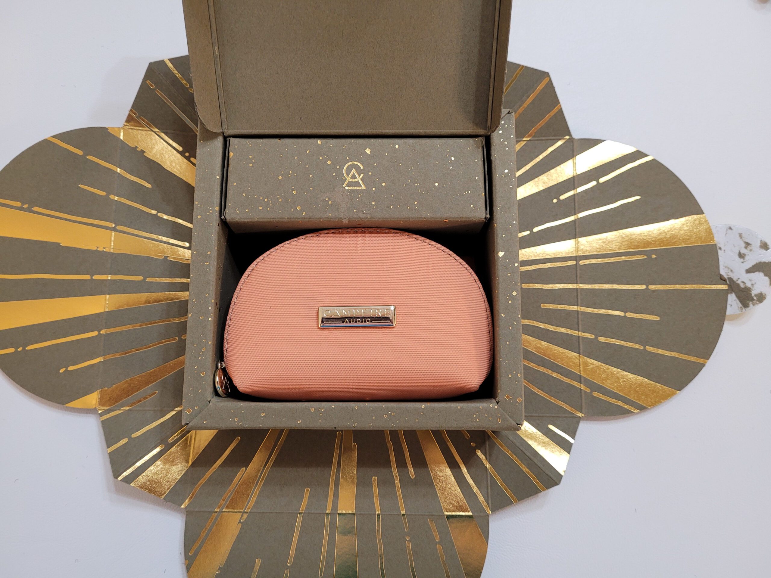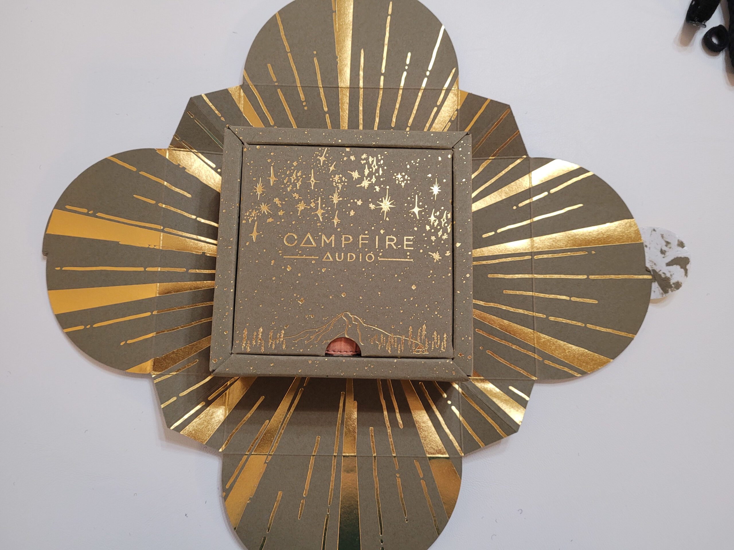 Campfire’s packaging on these is quite unique as it has an outer wrap over the box with the label on front showing the brand information and the earpieces and a foil seal on the reverse holding the wrap in place. When removed the petals unfold to reveal a starburst pattern with the box at center. The box itself uses Campfire’s star field pattern as we’ve seen in most of their packaging for quite some time now. The soft case takes up most of the space and the earpieces themselves are shipped in a two pocket bag inside the case to prevent scratches in transit. The Kit includes earpieces, cable, a soft zipper case, two of the two-pocket bags for earpieces and tips, a large assortment of 3 styles of tips (Silicons, Foams, and Final Audio E series), and a cleaning tool. The requisite warranty card is also in the bottom of the package. Overall, its a well thought out kit with plenty of protective packaging and tip options.