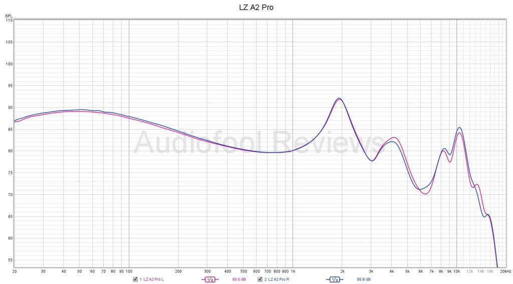 The A2 Pro uses a 10mm dynamic driver and a pair of Knowles balanced armatures. LZ is pretty tight lipped about which armatures or specifics about the dynamic driver so exact model numbers will have to come from a tear down. Best guess is the armatures are 30017 although there are a couple other models in the Knowles line-up that are also possible (30095 is usually a bit hotter and doesn’t cover mids as much and 32257 has the opposite problem) so since LZ lists the armatures as a pair of mid/high drivers, the 30017 is a more logical pick). Nominal impedance is 15Ω with a sensitivity of 108 dB/mW. Those numbers should mean the A2 Pro is easy to drive but requires some source matching as the low impedance requires a source with a less than 2Ω output impedance to do its best work. I found the A2 pro easy to drive from a table or dongle and while it does scale a bit qualitatively with better sources, the ceiling is fairly low so those using dongles or tablets as source won’t be missing out.
