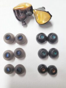 I never did find an explanation of the two styles of tips included with the A2 Pro. As a matter of fact their own ad copy simply states “some silica gel tips” in the inventory list without elaborating on count, style, or size. I found the gray/blue core tips to have a bit more low end presence and be a bit tamer at the top end while the narrower colored bores decrease bass quantity slightly and made the treble a bit more pronounced.
