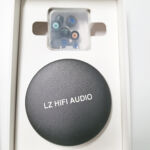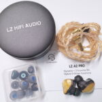 The A2 Pro ships in a while lift top box with the LZ logo in the center in gloss black. An outer slipcover has the earpieces and model name on front and the specs on reverse but the box itself is rather subdued. Inside the box we are greeted with a velour foam layer with the earpieces at top and the pill style case below. Removing the foam reveals a small clear plastic box of tips in two styles. There are small, medium, and large tips in a gray transparent silicone with blue cores and a set of black silicone tips with colored cores. The cable is hiding inside the hard case and a