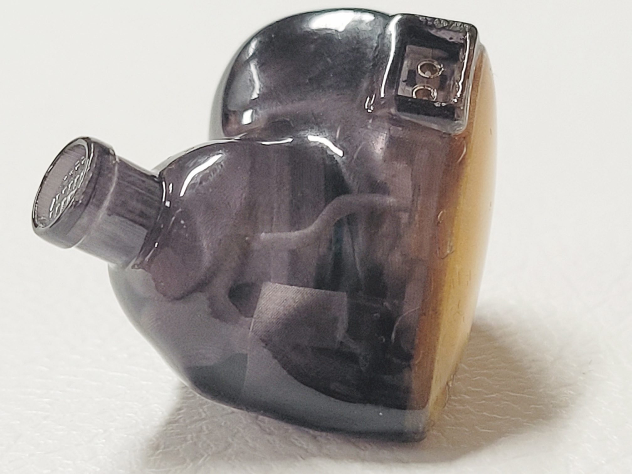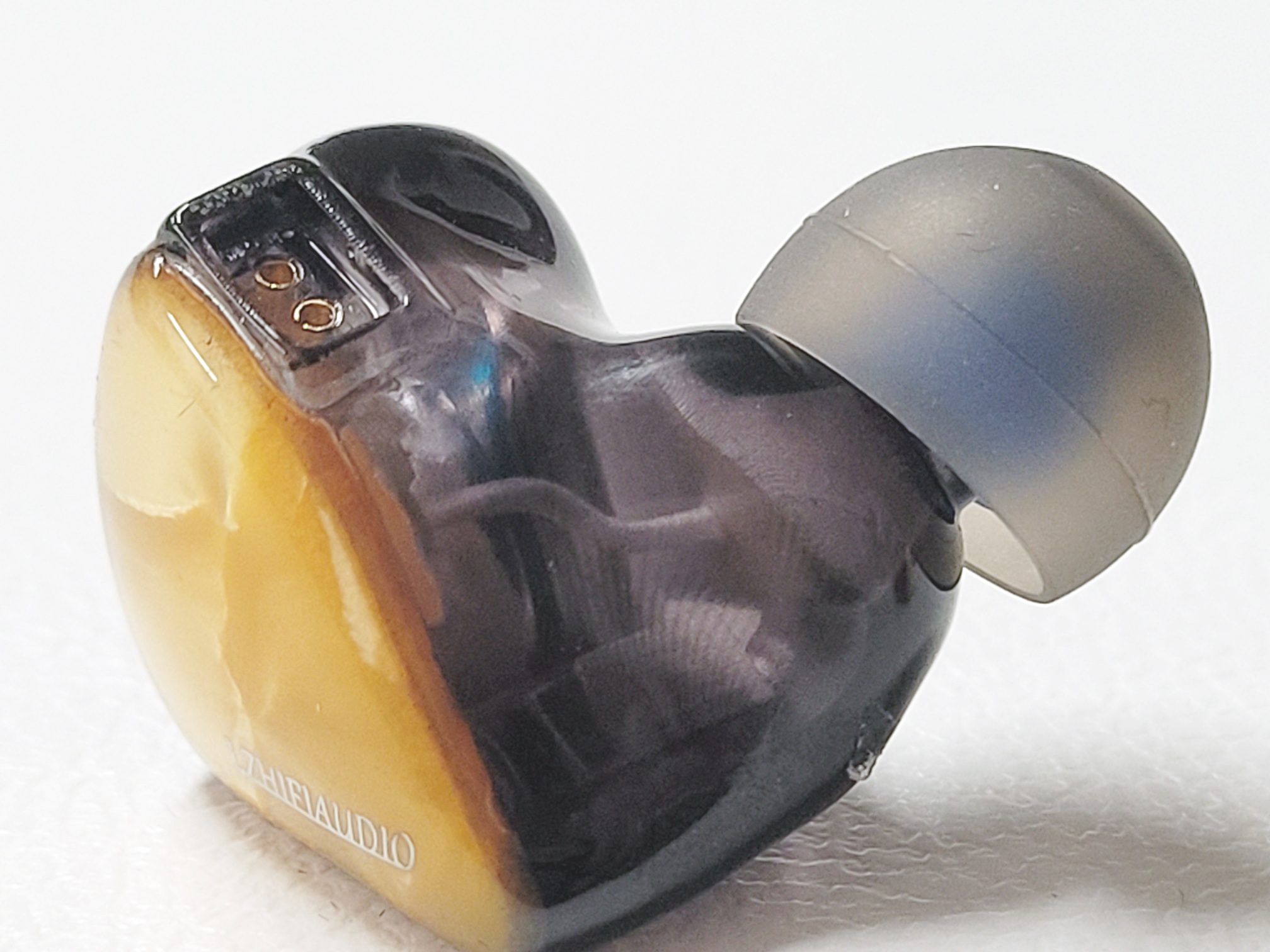 The earpieces are a 2 part design made entirely of resin with a black translucent inner shell and a gold marbled face plate. Nozzles are part of the inner shell and have a lip for tip retention and a forward and slightly upward rake when seated in the ear. Insertion depth and isolation are about average as most of the body sits behind the ear canal. The body itself is the now common semi-custom tear-drop shape and should be an easy fit for all but the smallest ears as it is on the smaller side. The bulk of the body sits in the ear and with very little heft to the earpieces and pre-formed hooks on the cable what little weight is present is well distributed. I found the A2 Pro comfortable for long wear with no physical fatigue.