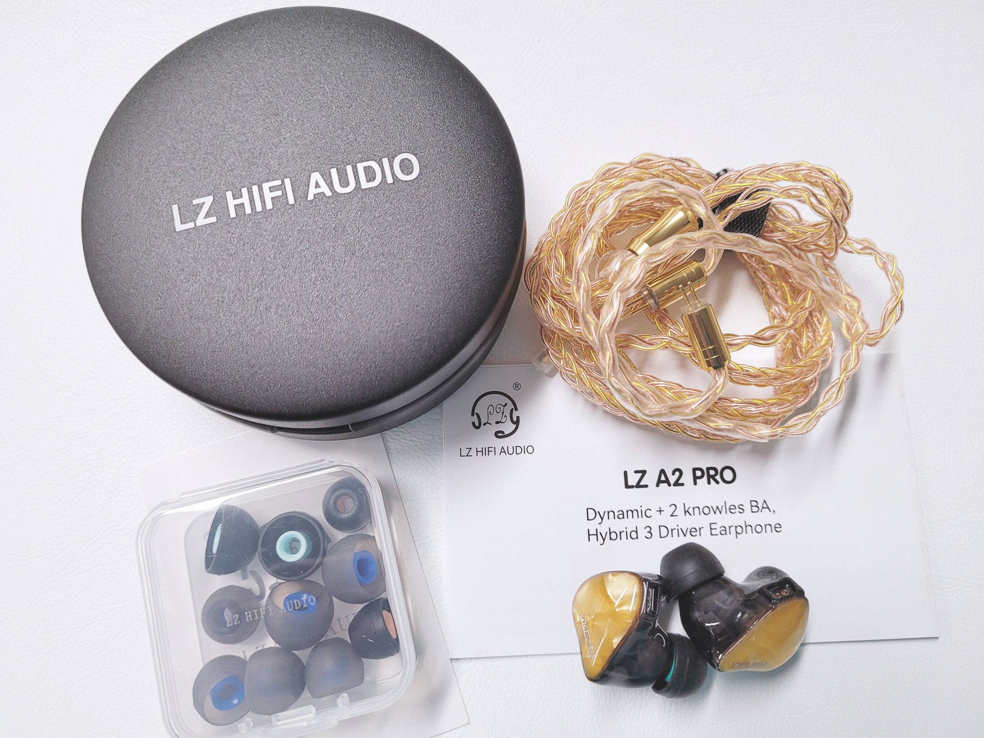 The A2 Pro ships in a while lift top box with the LZ logo in the center in gloss black. An outer slipcover has the earpieces and model name on front and the specs on reverse but the box itself is rather subdued. Inside the box we are greeted with a velour foam layer with the earpieces at top and the pill style case below. Removing the foam reveals a small clear plastic box of tips in two styles. There are small, medium, and large tips in a gray transparent silicone with blue cores and a set of black silicone tips with colored cores. The cable is hiding inside the hard case and a