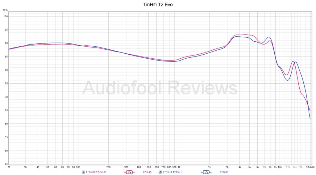 Lower treble continues the plateau started with the upper-mids and that same plateau extends through the treble range up to roughly the 8kHz mark. This gives the T2 evo a very even, but very bright top end. Lower treble has good detail and clarity but may be a bit too hot for the treble shy. Snare rattle is crisp but cymbals can be a bit splashy with hi-hat bordering on metallic at times. Again this seems to be somewhat volume dependent as lower listening volumes seem a bit less prone to the splashy cymbal hits. Top end air is fairly good in spite of an early roll-off but sparkle is limited which is probably a good thing as with the rest of the tuning it would likely be sizzle more than sparkle. Final roll-off is somewhere around the 13kHz mark where it abruptly drops.