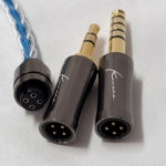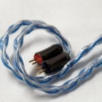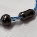 The cable is another big upgrade from the original Idun. Both the original and the new version sported silver plated oxygen free copper cores but this new model has a new swap-able jack sytem that the original did not. The cable itself terminates in a 4 pin female connector with an indexing notch to assure proper alignment. the cable connector plugs into a matching receptacle on the jack and locks firmly in place. Jacks in both 3.5mm TRS and 4.4mm Pentaconn are provided so the Idun2 is ready for balanced or single ended use right out of the box. A 6.35 mm adapter is also provided but requires the 3.5mm jack be used as it does not connect directly to the cable terminus. Above the jack the cable is 8 strands (4 in blue casing and 4 in clear) from the jack up to the splitter. The splitter and bead chin-slider match the gun-metal jack housing as do the bi-pin housings at the northern end. Cables exit the splitter as 4 wire braids up to the earhooks and 0.78mm bi-pin connectors. The right connector has a red pin-base for easy indexing and since they seat into recesses in the earpiece body the aesthetic isn’t harmed in the process.