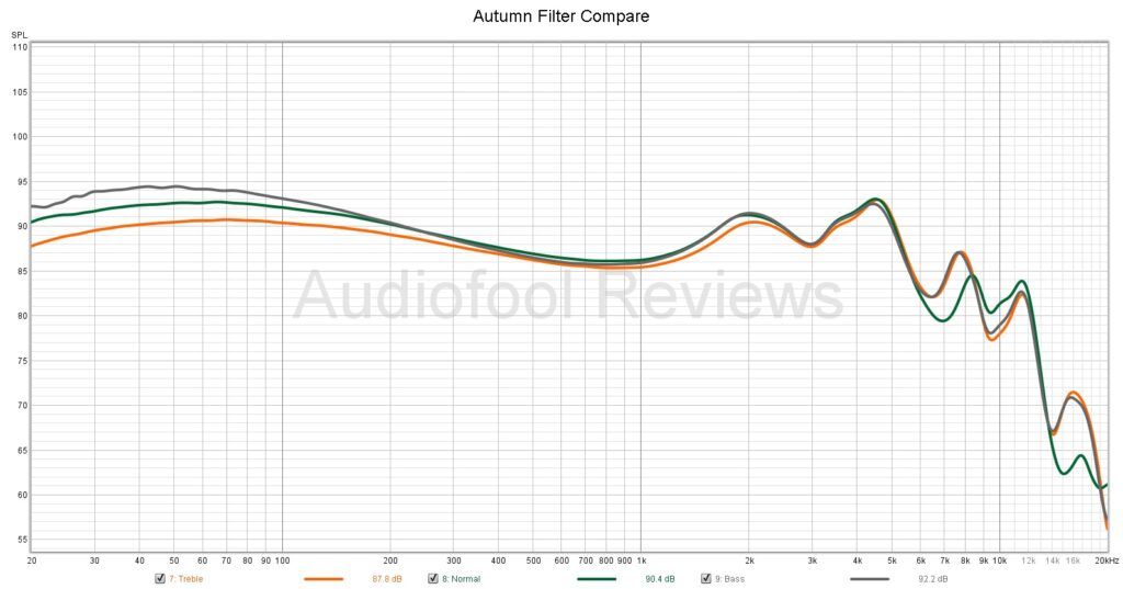 Looking at the FR graphs, one will note that there is no difference in the top end with the normal and treble filters. That doesn’t mean you won’t hear differences because of the degree the treble is exposed and emphasized. The Normal filter has a better balance between the low end and the treble and helps keep it from sounding overly forward or bright and again keeps a more natural tonality than the treble filter. The treble filter reduces the low end resulting in what we hear as a treble emphasis with a bit more energy and better dynamics. Detail is the same with either filter but is easier to pick out with the emphasis of the treble filter so some will likely note more details with the treble filter in use. The bass filter again shifts the emphasis even further to the left and leaves the treble feeling a bit less open at the top and a bit less energetic compared to the other two filters.