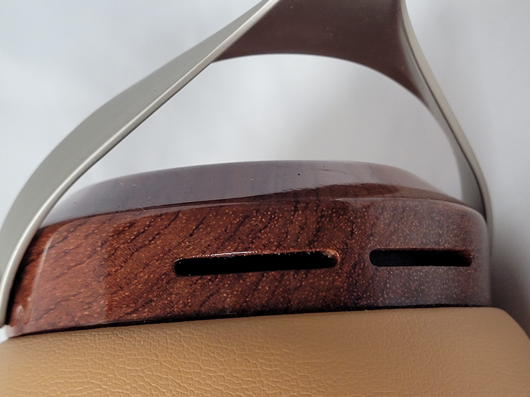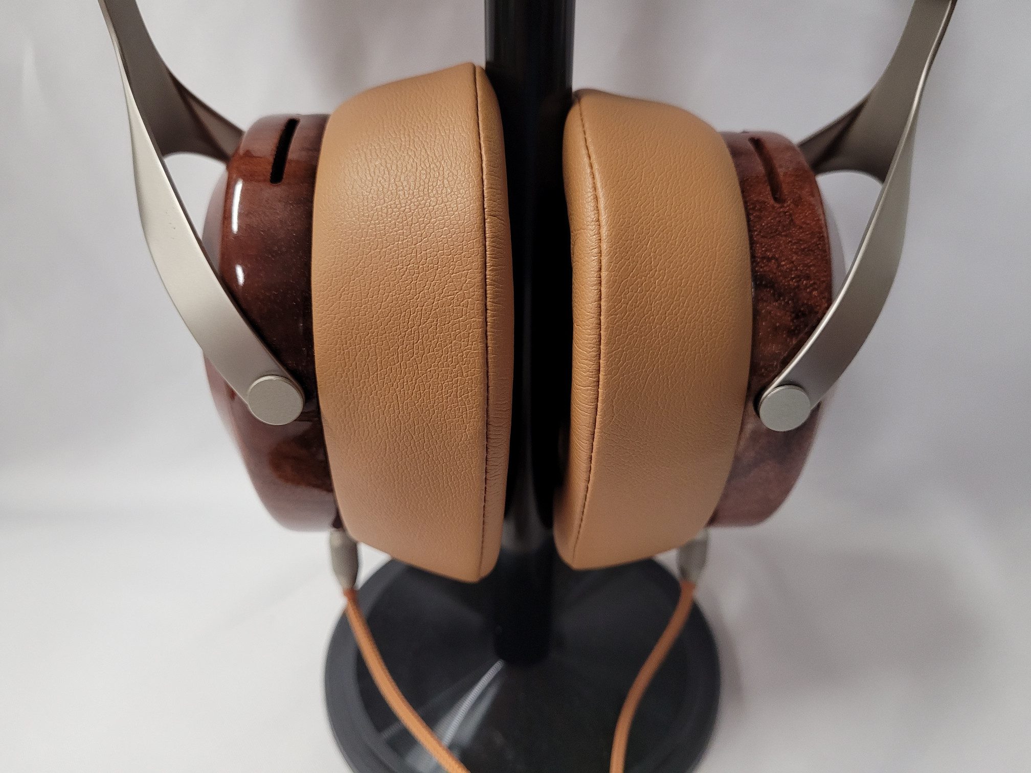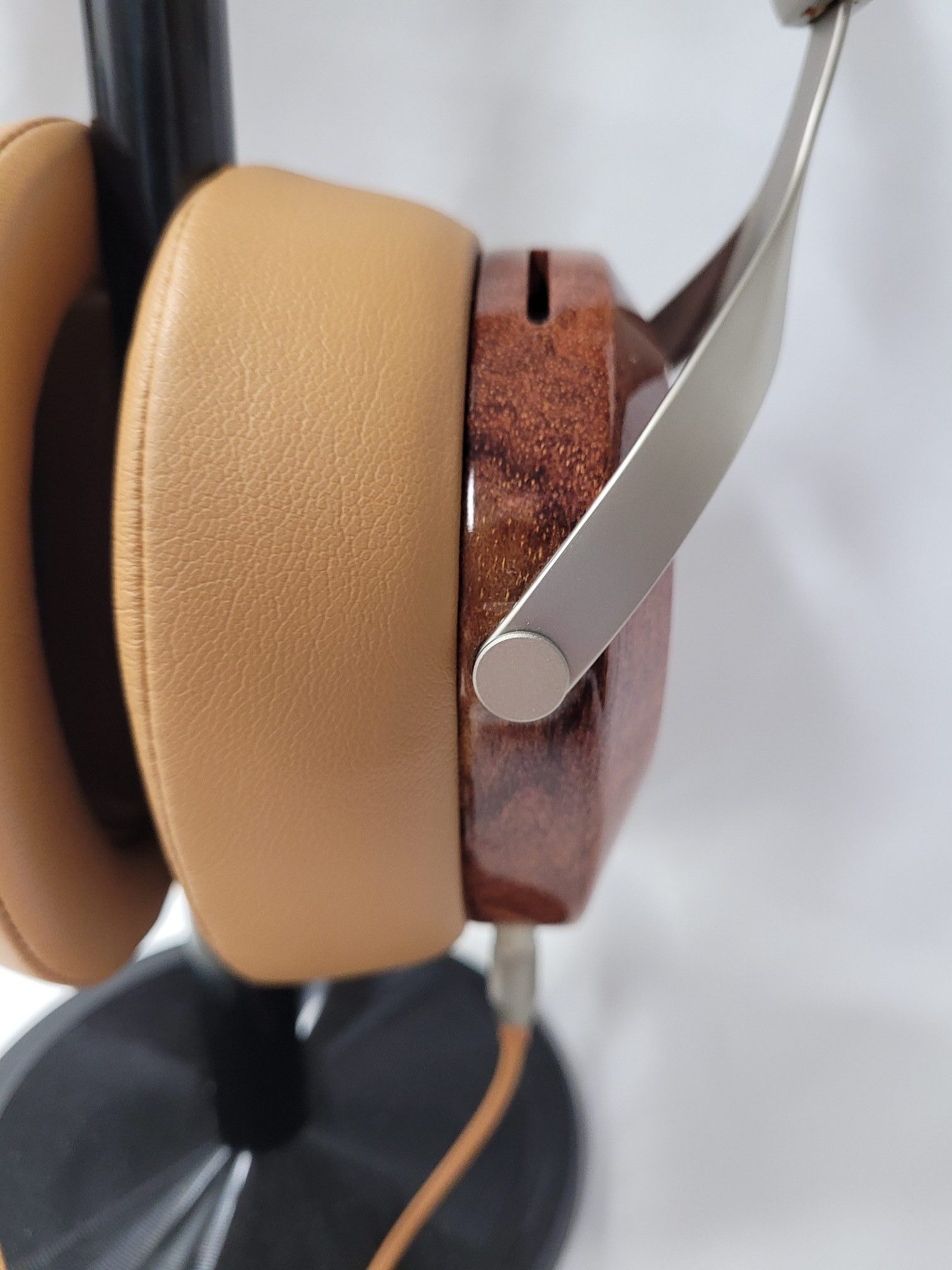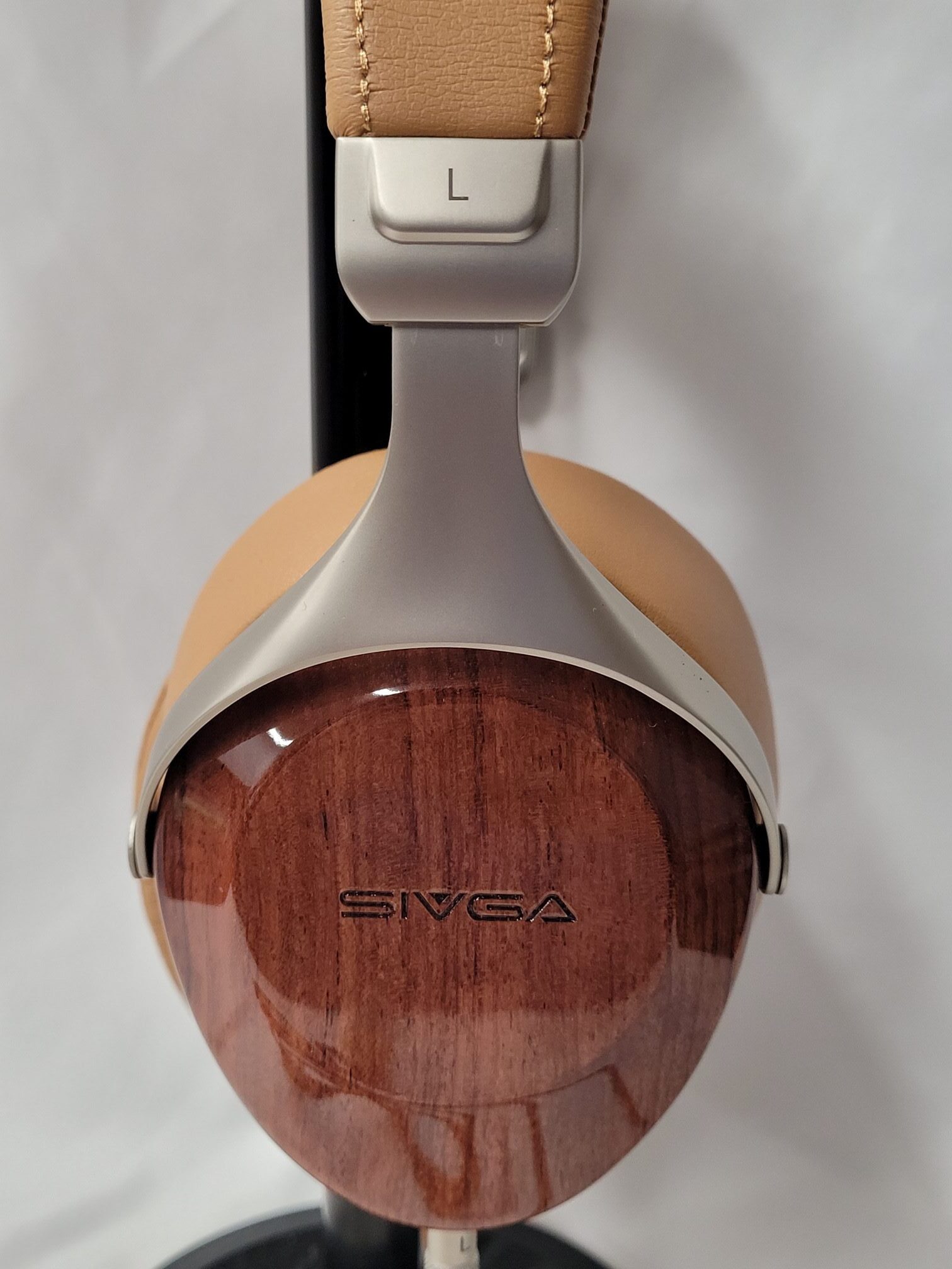 Construction on the Robin is quite good for the price but there is some dichotomy as the cups are well finished wood and the pads and headband sport a leather-like feel with memory foam where it is needed. The headband for example has a soft high lift foam on the under-side where it contacts the head and a thinner stiffer foam on the upper band where it does not. Metal parts have a brushed finish and are largely stamped parts. The gimbals do have very positive click adjustments with good range but have no rotation on the vertical axis as they have no hinge to allow it. Horizontal rotation is roughly 30º. I had no issues with fit but some with glasses may. The wooden cups have Sivga printed on the outside and 2.5mm ports at the bottom-most point. Pads are removable by twisting which reveals a plastic baffle inset into the cup. Replacement pads are available directly from Sivga should the need for replacement arise. There are two colors available, the one shown here in brown,tan and silver and another blacked out model with dark wood, black pads and headband and darker metal fittings and gimbals.