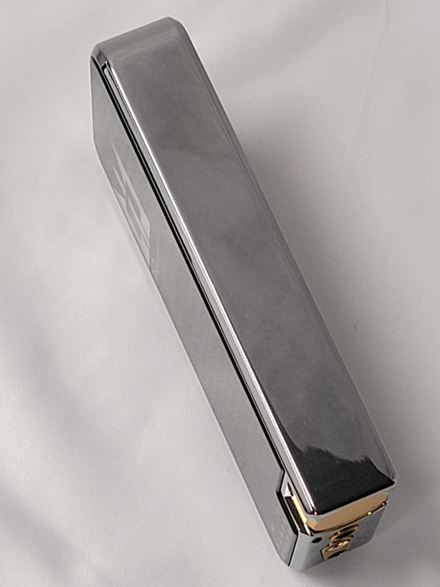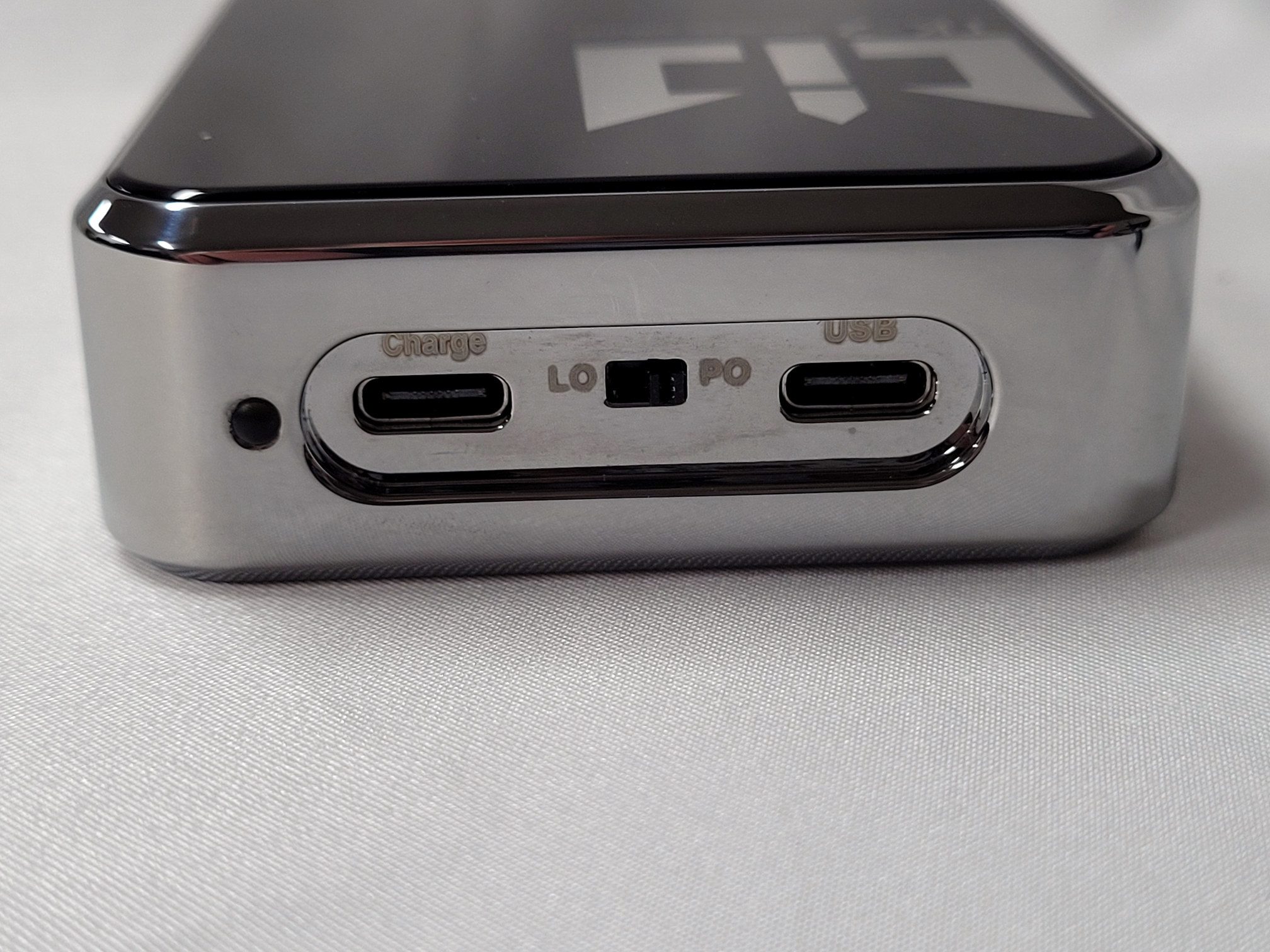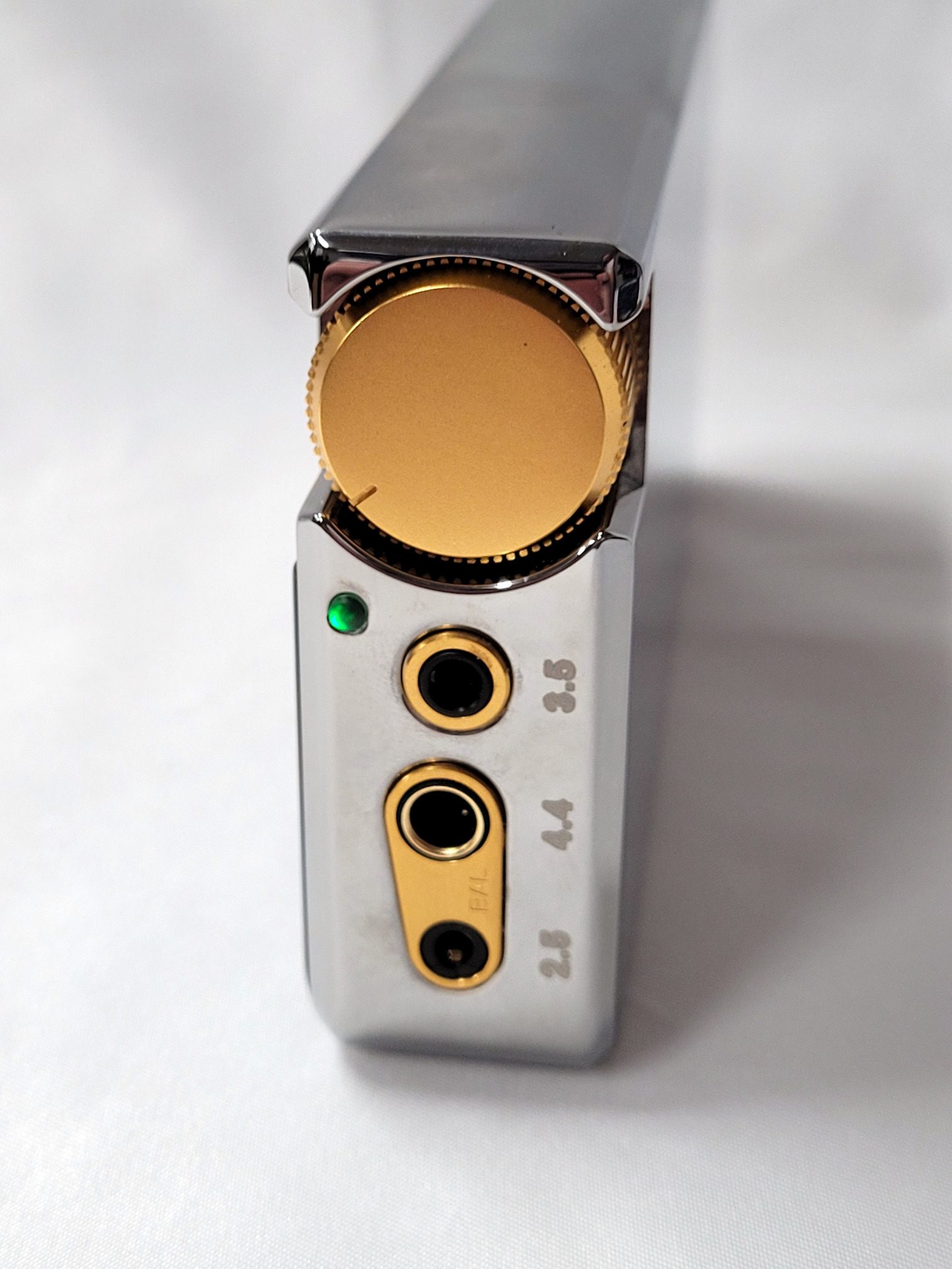 There is no doubt this is a high-end looking DAC/amp with its polished metal and black glass finishes but it is also a complete fingerprint magnet. There is no surface that can be touched without leaving prints and the back is so highly reflective that it picks up the scale pattern of the lights in one picture. The TK2 is available in either polished chrome or black chrome frame with a black glass face and brass accents. The frame is a solid billet of aluminum machined to shape and then polished to near perfection before the internals are loaded. One word of caution is that the device is fairly easily scratched and by the time it arrived at my door for the tour it was pretty scuffed up. I used some Flitz metal polish to bring out most of the little surface scratches but one near the volume know is still visible. I would recommend a case for users who intend to carry the TK2 to prevent scarring it. I have no worries about its survival as heft is quite good, but cosmetically a case is in order. All the controls are on the ends with both sides slick. Near the top face, we have a series of LEDs that run across the glass face that indicate the type and sampling rate of the source file. On the top face itself from left to right are 2.5, 4.4, and 3.5mm ports, a single LED indicator power indicator, and the large volume knob. At the bottom of the device, two USB type-C ports for charging and connectivity are separated by a line out/ pre-amp out switch that controls whether output is fixed or volume controlled. There is also an LED on the bottom face to indicate charging status.