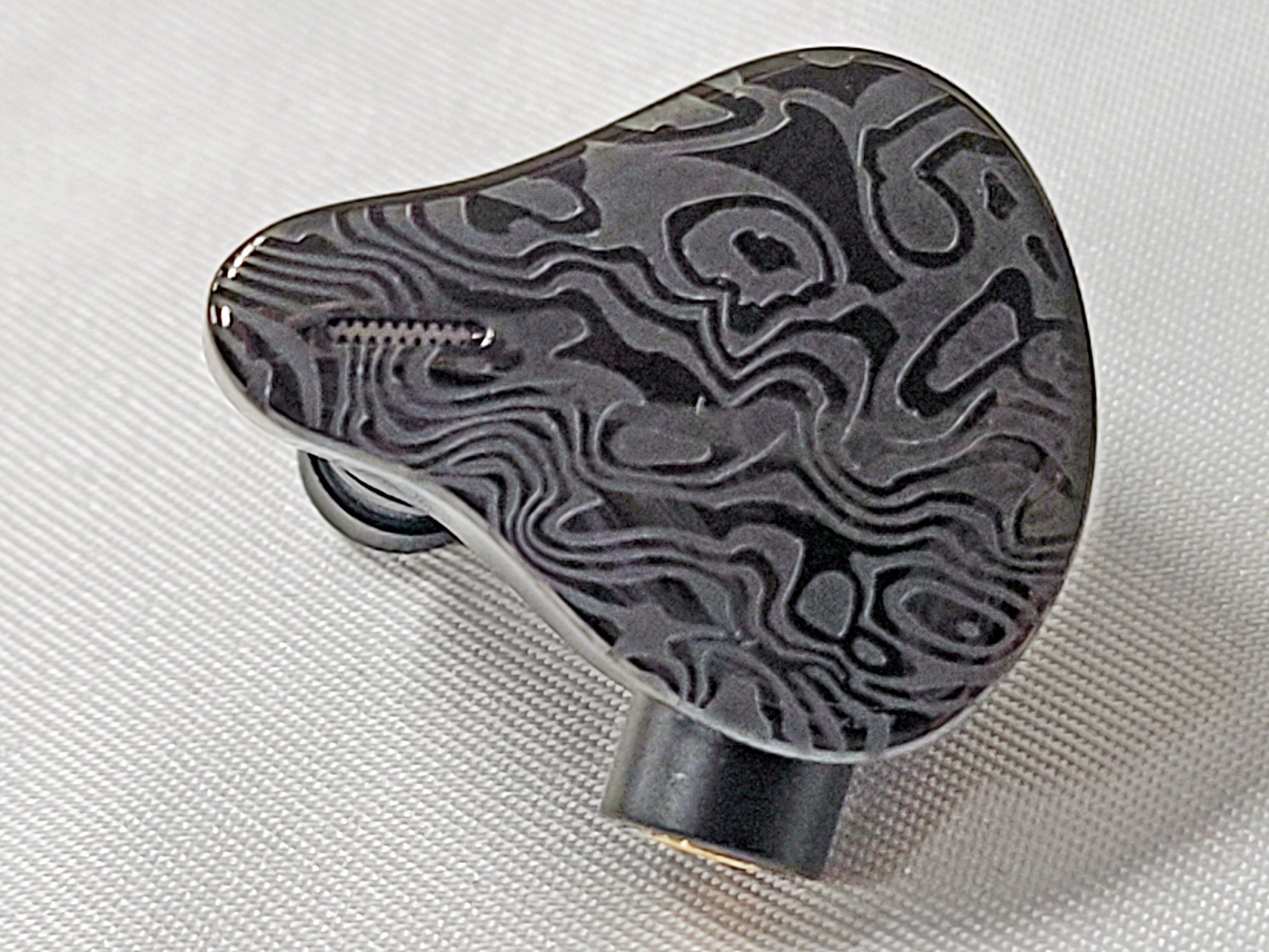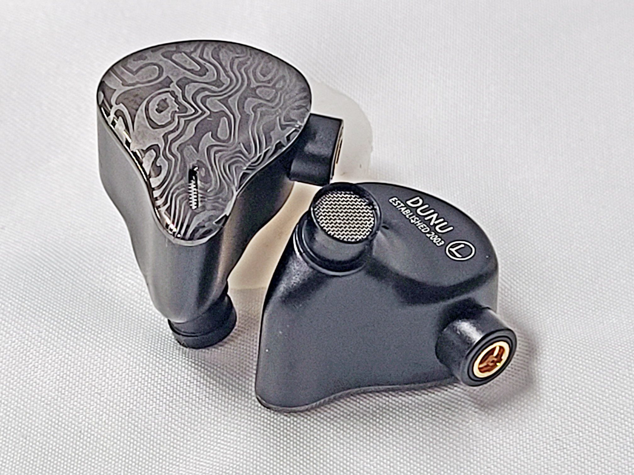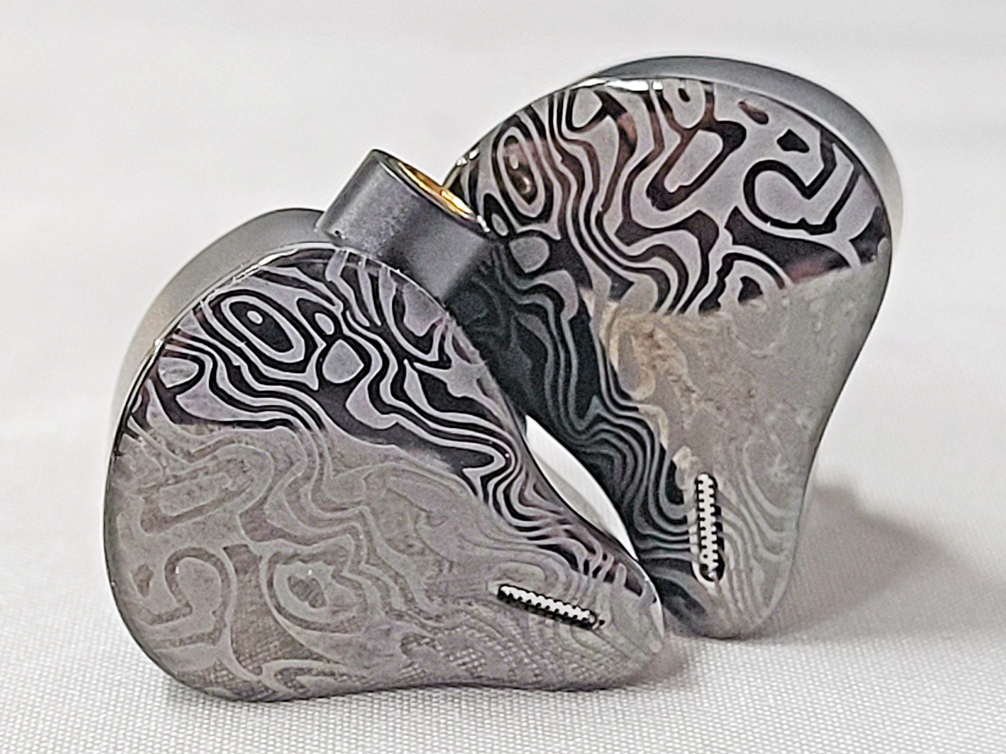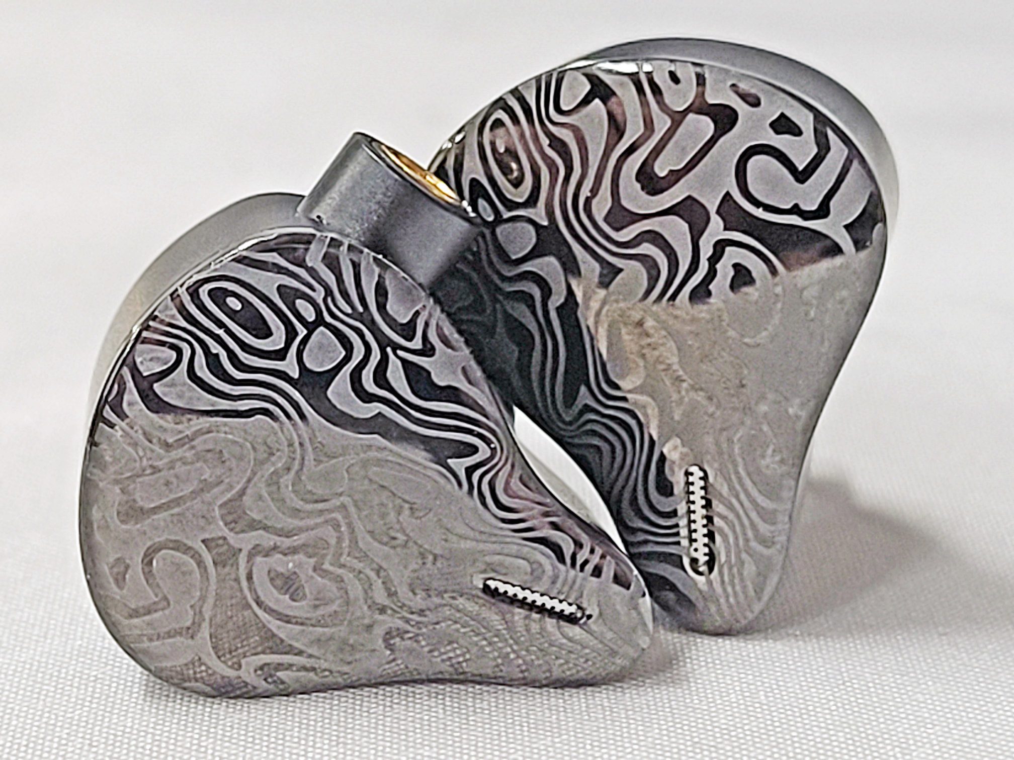 The shell is mid to large size with a solid aluminum inner shell and a Mokume face plate. Mokume-gane is a Japanese technique similar to producing Damascus steel that uses different metals that are folded, compressed, and chiseled to expose different layers when the metal is flattened into a sheet. The process was originally used to make the decorative fittings on Samurai swords and has been used to make high end jewelry, watches, and fittings in more recent times. Tiffany & Co silversmiths are credited with introducing the technique to the west in the late 1800s and used Mokume in a number of designs through the early 1930s when the depression forced them to cut back. The Mokume process creates unique pieces so no two of the shells will look exactly alike but all have a two tone gloss and matte gray swirl pattern. I appreciate the subtlety in the design. There is a single vent in the face plate directly behind the nozzle and no venting on the underside. Nozzles are on a raised pedestal with a slight forward rake for fairly deep insertion. Connections are by MMCX with the body having a raised port on the leading side of the body. I found the Vulkan comfortable and with the tip-up wear style and ear-hooks the units stay put well during exercise.