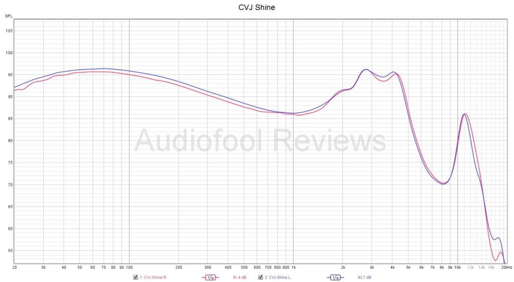 The lower treble climbs to almost the same level as the sub-bass and plateaus for most of the lower treble range before dropping off significantly just above the 4kHz mark. There is plenty of energy in the lower treble which keeps the Shine from sounding enclosed, but the drop-off in the mid-treble keeps cymbals from sounding correct and limits air at the top a bit as well. There is a push back between 10 and 11kHz that brings back some air but the gap between 4kHz and 10kHz gives the treble an uneven sound. Percussion snap is crisp with good snare rattle and there is some detail to the treble but that too is somewhat limited.