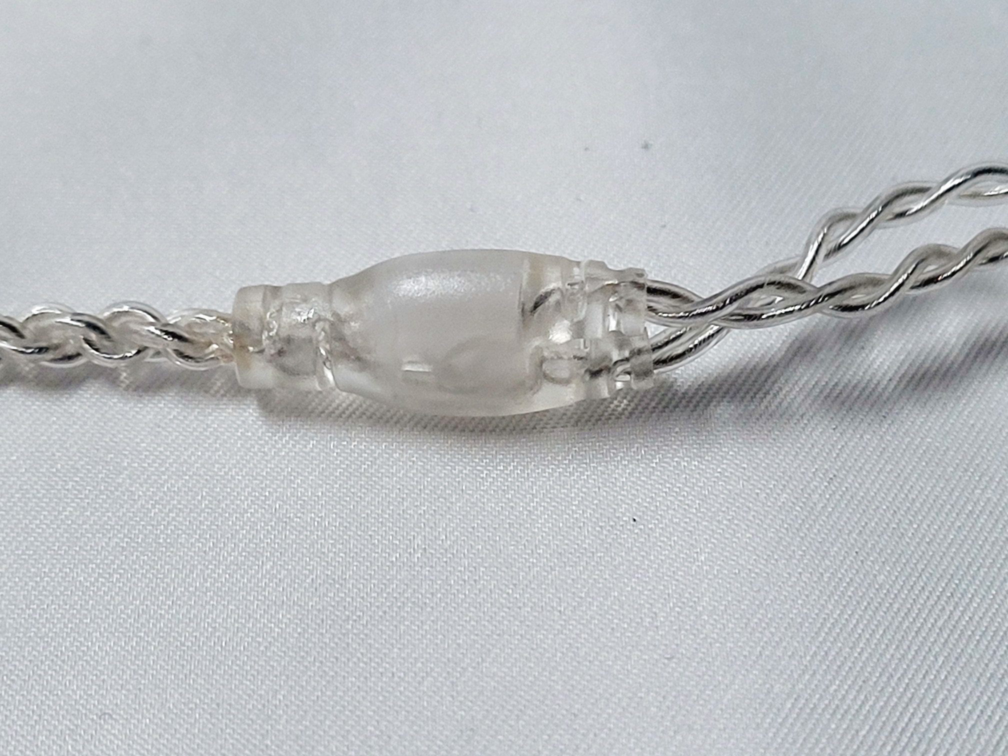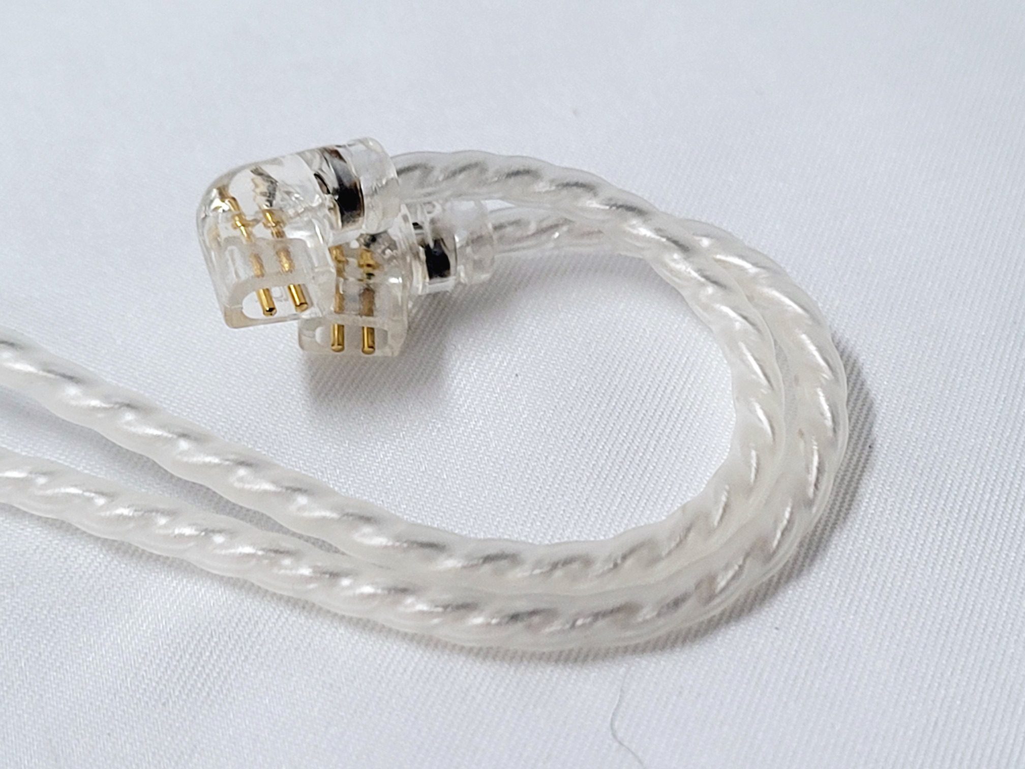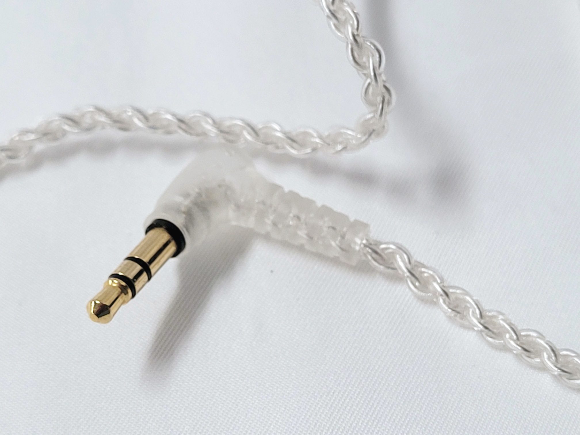 The cable is silver plated copper strands in clear casing with a double twist pattern from jack to splitter and a fairly tight twist of two strands above the splitter leading to each ear-hook. The jack is of my preferred 90º style with a short strain relief and a clear housing that matches that of the splitter. There is no chin-slider provided. Ear-hooks do not have memory wire but are tight enough that they fit snugly, and the hooded 0.78mm bi-pin connectors mate well to the raised connector on the earpiece surface. The L/R markings are embossed on the clear housings which can make them a bit hard to see so a drop of red paint on one side to help indexing would be appreciated.