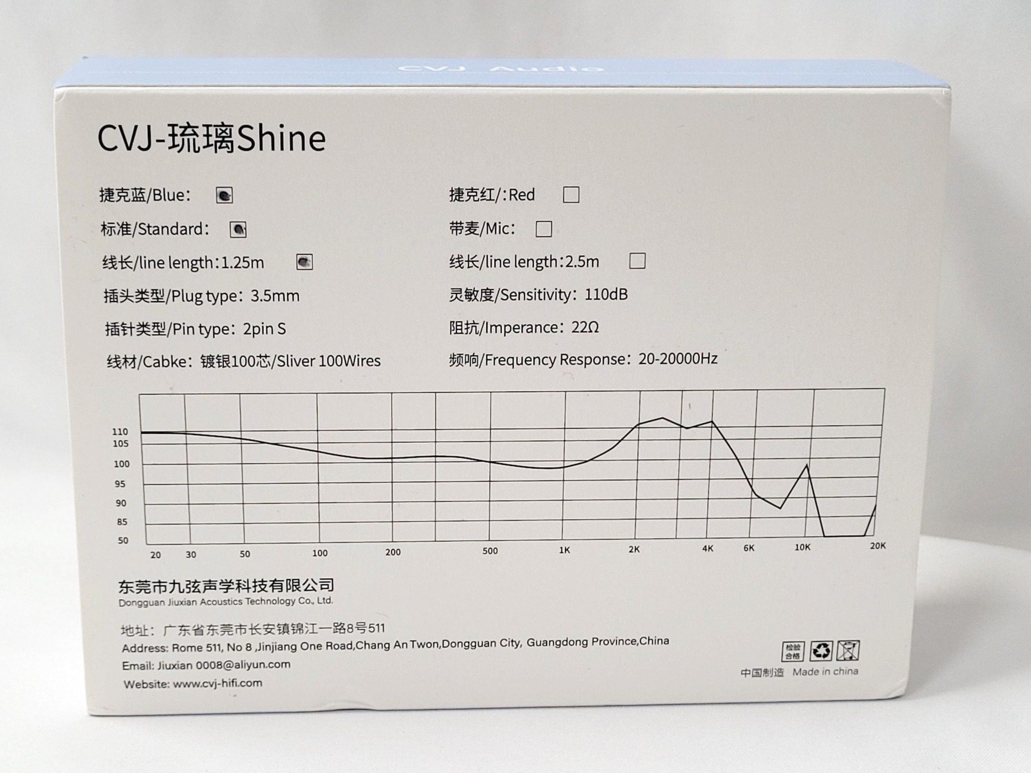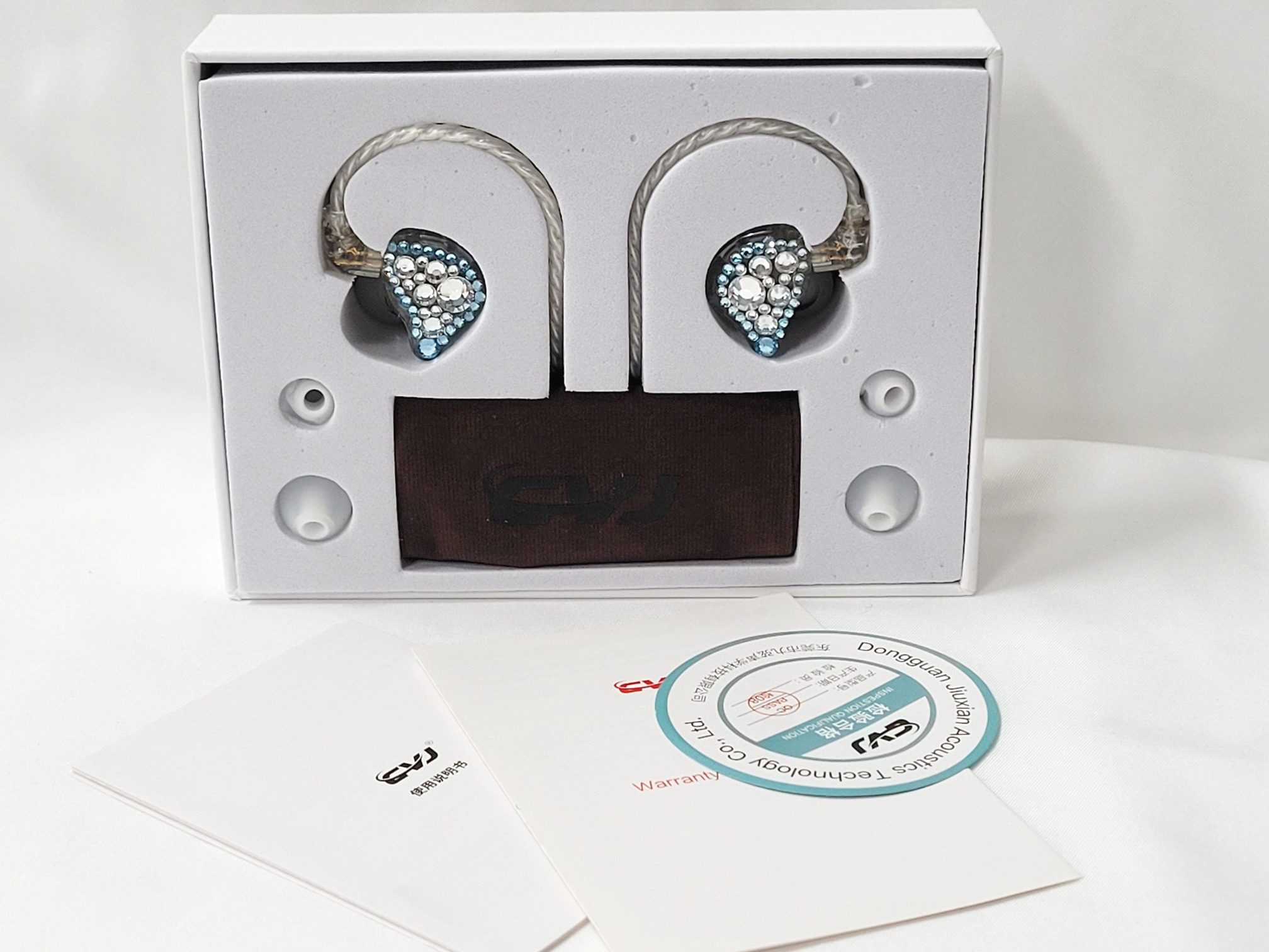The CVJ Shine are not for those who like to maintain a low profile as even the packaging has a large photo of the rhinestone encrusted face-plates. The name is also prominent, but for English, you’ll need to take a look at the reverse. The rear of the box shows the specifications in both Chinese and English as well as an FR plot that fairly closely matches what I found on my measurement system. Opening the box reveals the earpieces in a foam surround, two extra pairs of tips, and a cloth carrying case. The cable is neatly tucked away under the foam and case giving the presentation a nice clean look. There is also a warranty card and instruction booklet that round out the package. Not a lot of extras for an in-ear at the $40 USD price point, but it does come with everything needed to start listening immediately.