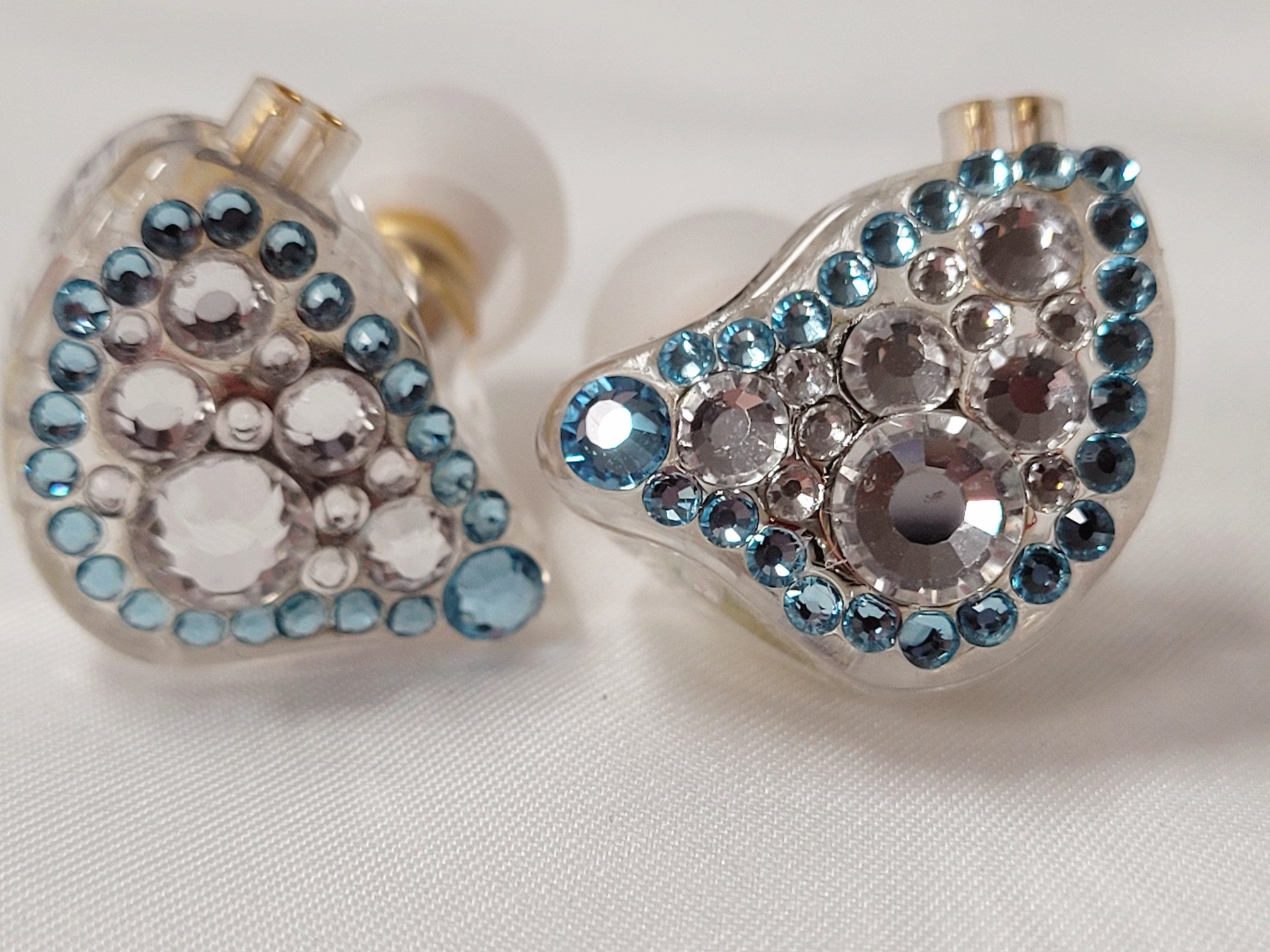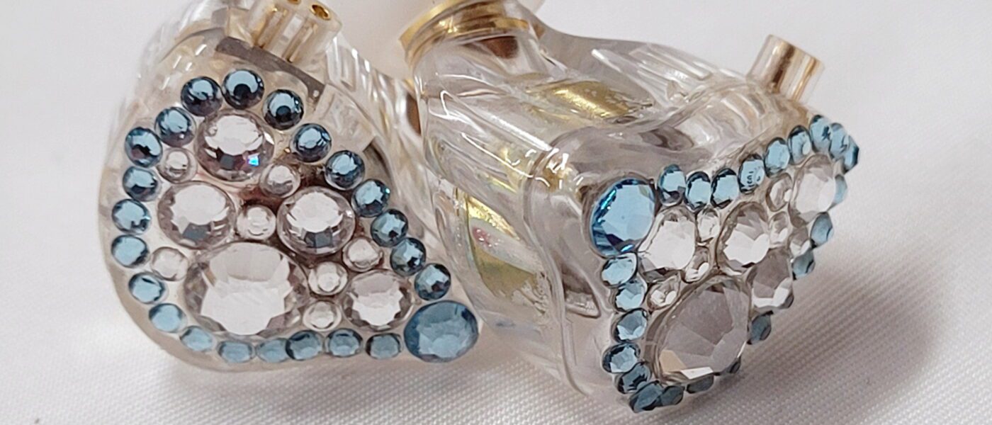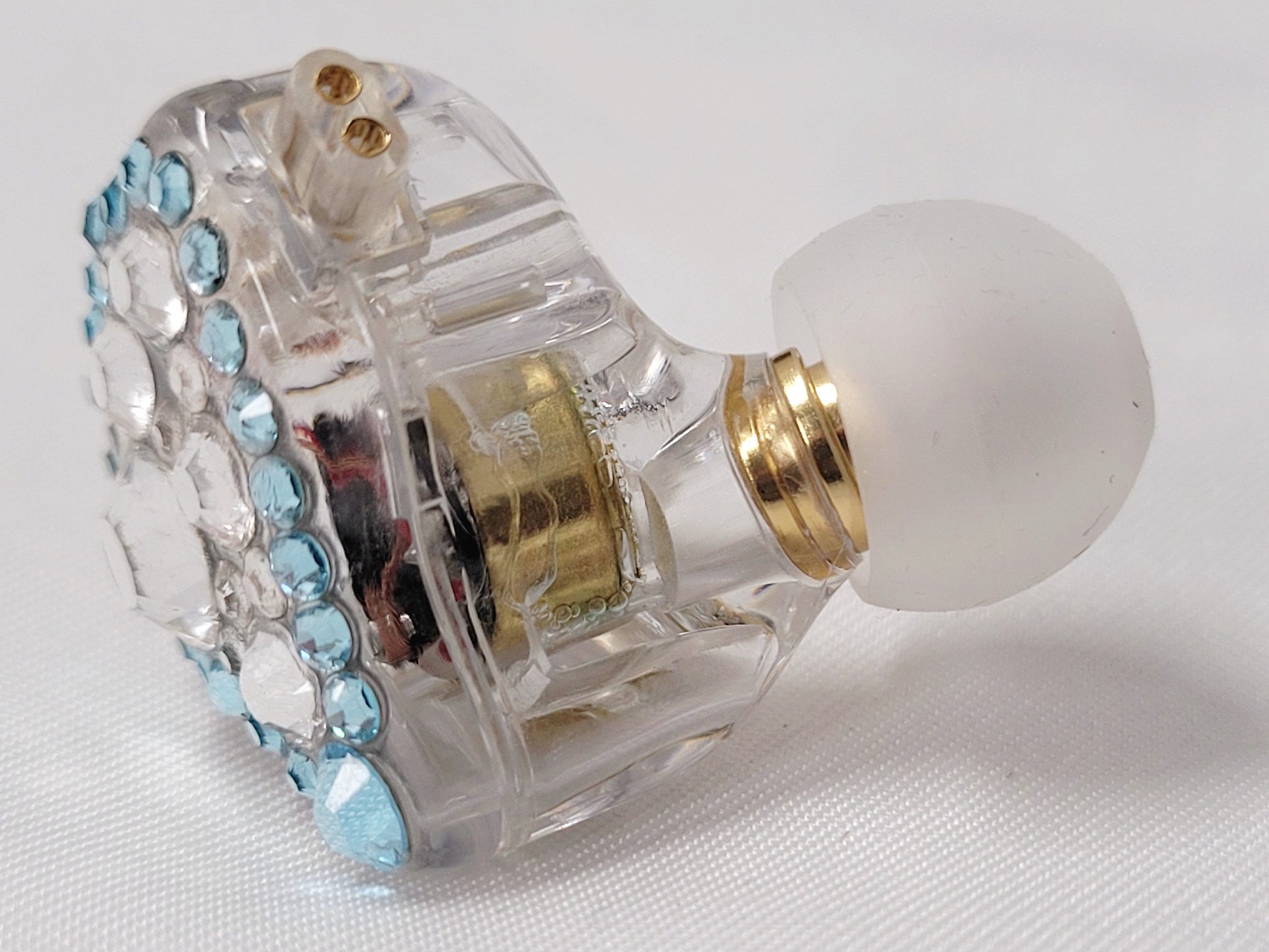 It’s hard to miss the Shine as the Rhinestone encrusted face-plates are either a big attraction or a major deterrent depending on whom you ask. The center of the face-plate is encrusted in clear Rhinestones (imported Czech cut glass) with the outer most ring available either in blue like my sample or a pinky red color. Honestly my first thought was these are best suited cosmetically to pre-teen girls as they remind me of an 90’s infomercial for the Bedazzler. Both my wife and my daughter liked them though so perhaps the market is a bit wider than I initially gave it credit for. Once past the face-plates, the earpieces are clear polymer of medium size with a raised bi-pin connector and brass nozzles. Fit was comfortable and insertion depth moderate which allowed me to use mid-sized tips instead of needing the larger size that some shallower models require. weight is good and there was no physical fatigue from long wear although I did get a few sarcastic comments about needing blue eye-shadow to accentuate my new look.