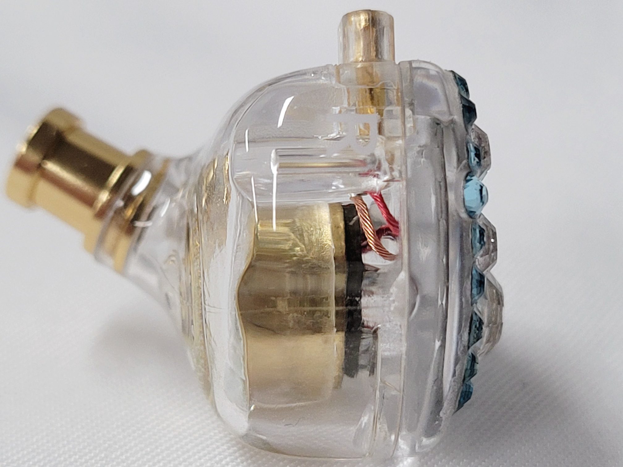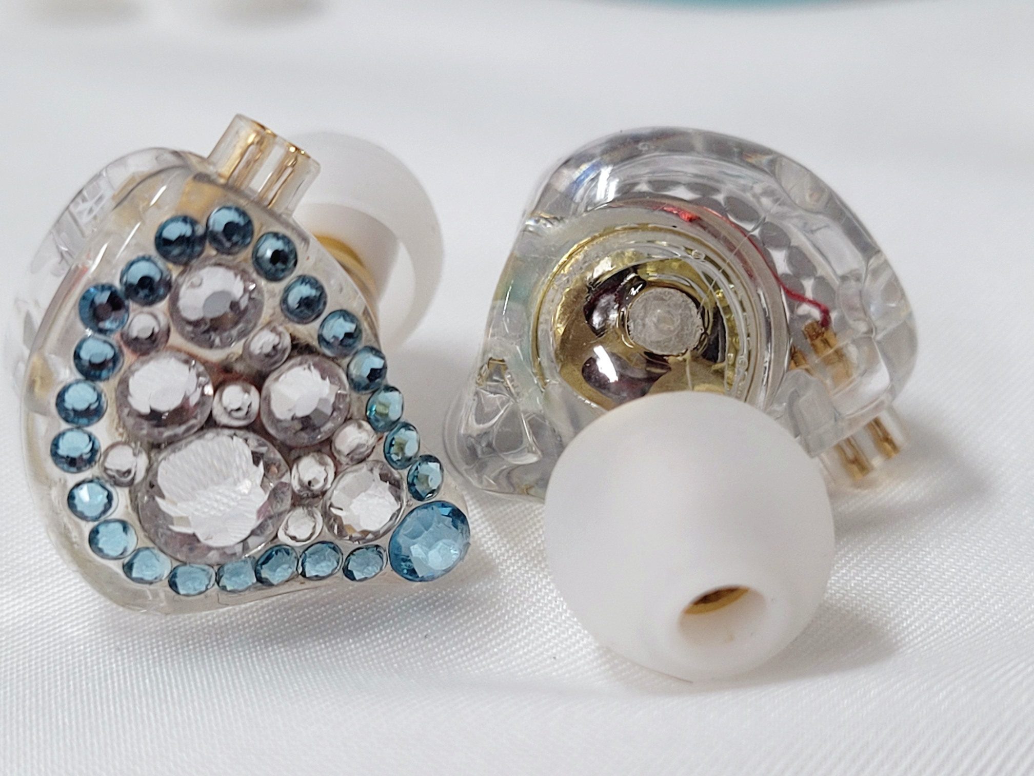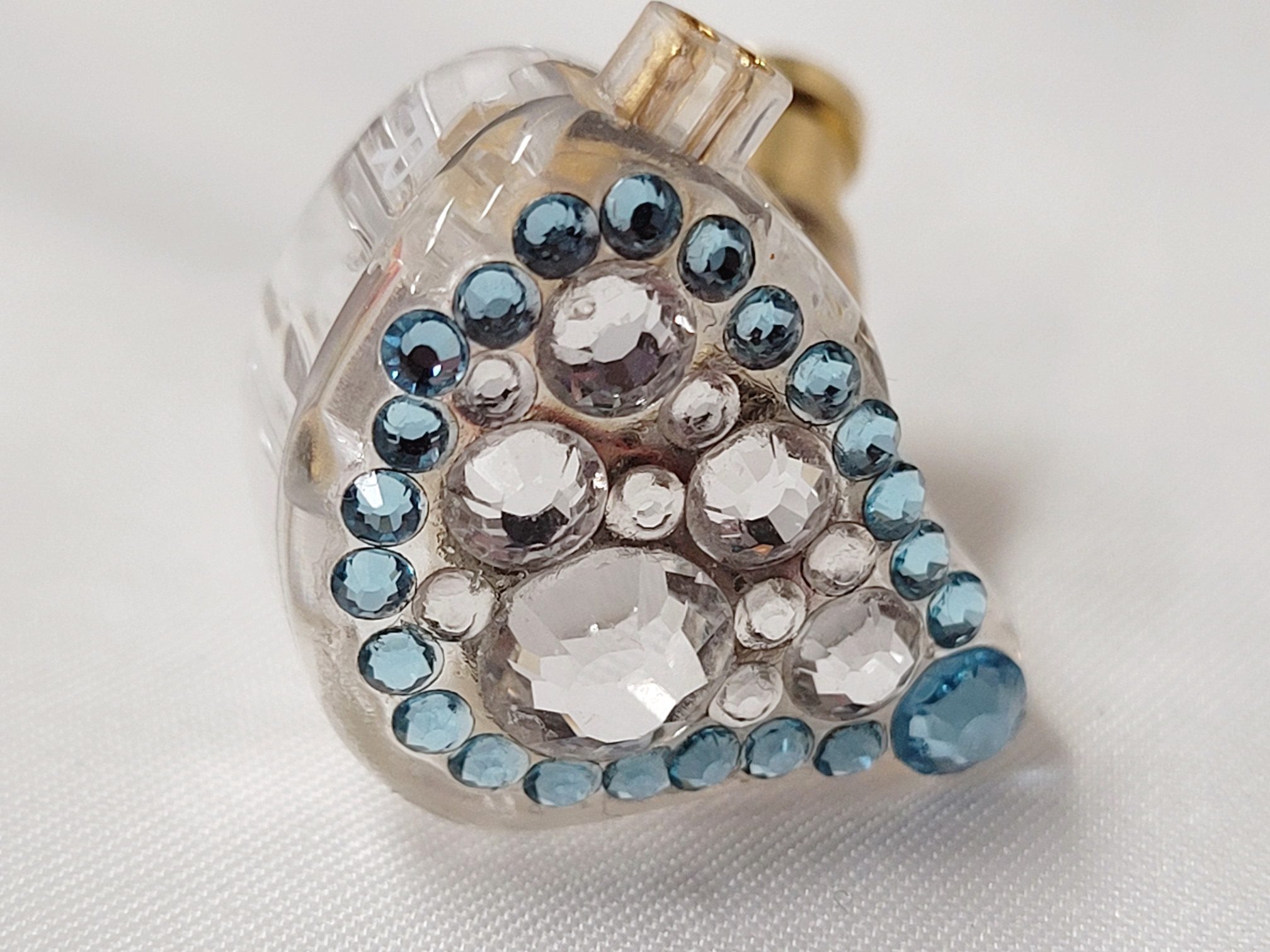 It’s hard to miss the Shine as the Rhinestone encrusted face-plates are either a big attraction or a major deterrent depending on whom you ask. The center of the face-plate is encrusted in clear Rhinestones (imported Czech cut glass) with the outer most ring available either in blue like my sample or a pinky red color. Honestly my first thought was these are best suited cosmetically to pre-teen girls as they remind me of an 90’s infomercial for the Bedazzler. Both my wife and my daughter liked them though so perhaps the market is a bit wider than I initially gave it credit for. Once past the face-plates, the earpieces are clear polymer of medium size with a raised bi-pin connector and brass nozzles. Fit was comfortable and insertion depth moderate which allowed me to use mid-sized tips instead of needing the larger size that some shallower models require. weight is good and there was no physical fatigue from long wear although I did get a few sarcastic comments about needing blue eye-shadow to accentuate my new look.