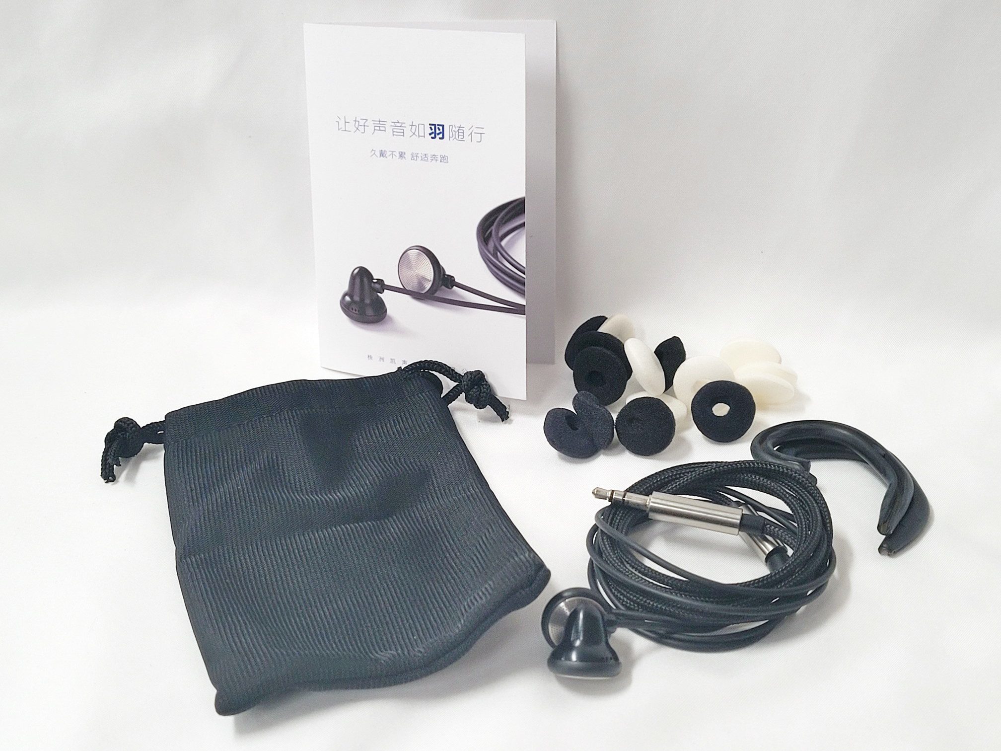 The box is matte black with only the word temperament in gloss black centered at the lower edge of the box. A label on the side gives a bit more details about what is hiding inside unfortunately for me, most of the information is in Chinese which I have very little skill with. Lifting the top of the box reveals the earbuds in foam surround at top and a flap hides the cable, earhooks, carrying bag, manual, and foams. There are 8 sets of foams including both donuts and solid foams in black and white. The carrying bag is simple but uses a thick material that affords some padding. The manual is very thin and again most of it is in a language I have no fluency in.