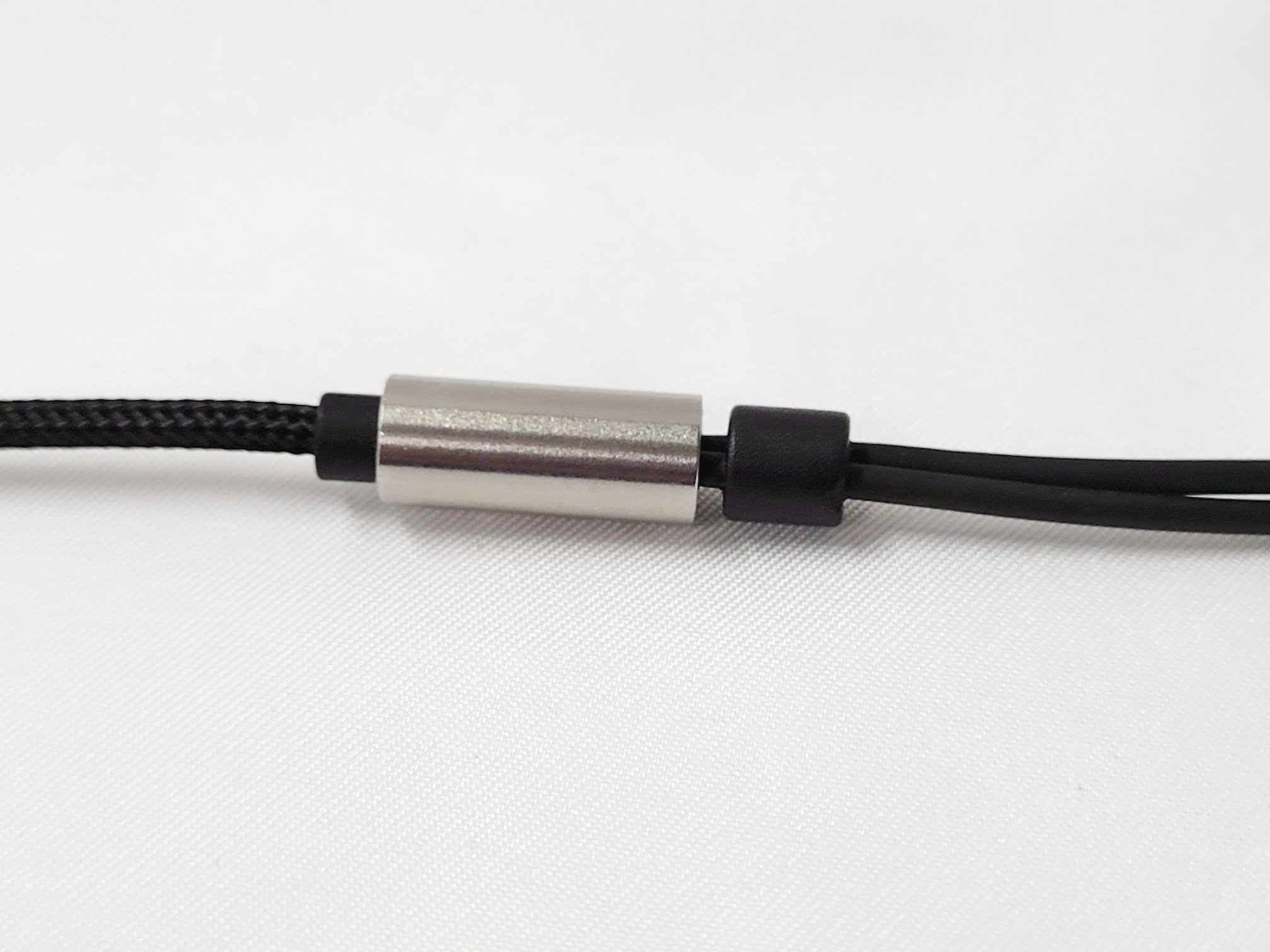 The cable is fixed with the lower end being cloth covered and the upper above the splitter instead using a soft rubber coating. Wire is Oxygen-free copper and silver plated oxygen-free copper mixed to ensure the best signal transfer, and the jack is gold plated as well for corrosion resistance. The Jack is the 3.5mm straight type with a silver metal housing and a short black plastic relief before the cable exits in its black cloth housing. The splitter matches the jack with a short relief below the brushed metal splitter and a black bead style chin-slider above. Cables enter the earpieces at the bottom rear of the bell shape and have a short metal stem to protect the entry point.