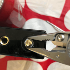 Once the volume knob is removed, there is a nut that must be removed before the board can be pushed out the rear of the case. A pair of needle nose pliers help here as there is little room to grip the nut due to the ledge on the faceplate. Once removed, pushing on the shaft of the volume knob should push the rear faceplate and board out the rear of the case.